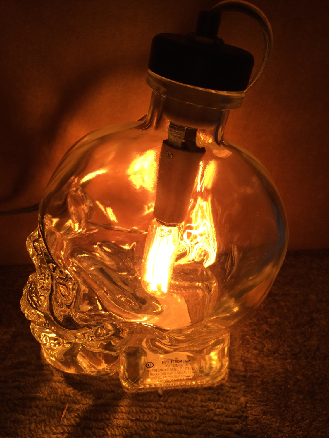 This listing is for a beautiful lamp created from a Crystal Head Vodka bottle. The bottle has been cleaned. The light is a 75 Watt candelabra base assembled to gray sheathed wire. It has a brown thumb switch on the plug end, gray cord, white socket socket and is attached to a modified cork so to change the bulb all you have to do is pull the cork out. This is perfect for a public or private bar or residence man cave to add subtle flair or to be included in any room as a conversation piece. We chose to attach a plug rather than a hard-wire mount so the light can be mobile and enjoyed in all places, even those you may not be allowed to rewire! The product comes pre-assembled so all you have to do is pick a spot and plug it in! As shown in some of the pictures, the light can be hung stylishly with a split ring connector and flange (which is available for purchase) or sit atop a desk or counter. Also available is the option to include a dimmer. This will allow you to set the light at a brightness comfortable for the occasion and will also allow you to use different bulbs that fit in the lamp while still achieving mood lighting. Dimmer comes in your choice of white or black. Contact us for custom orders, comments, ideas, etc.