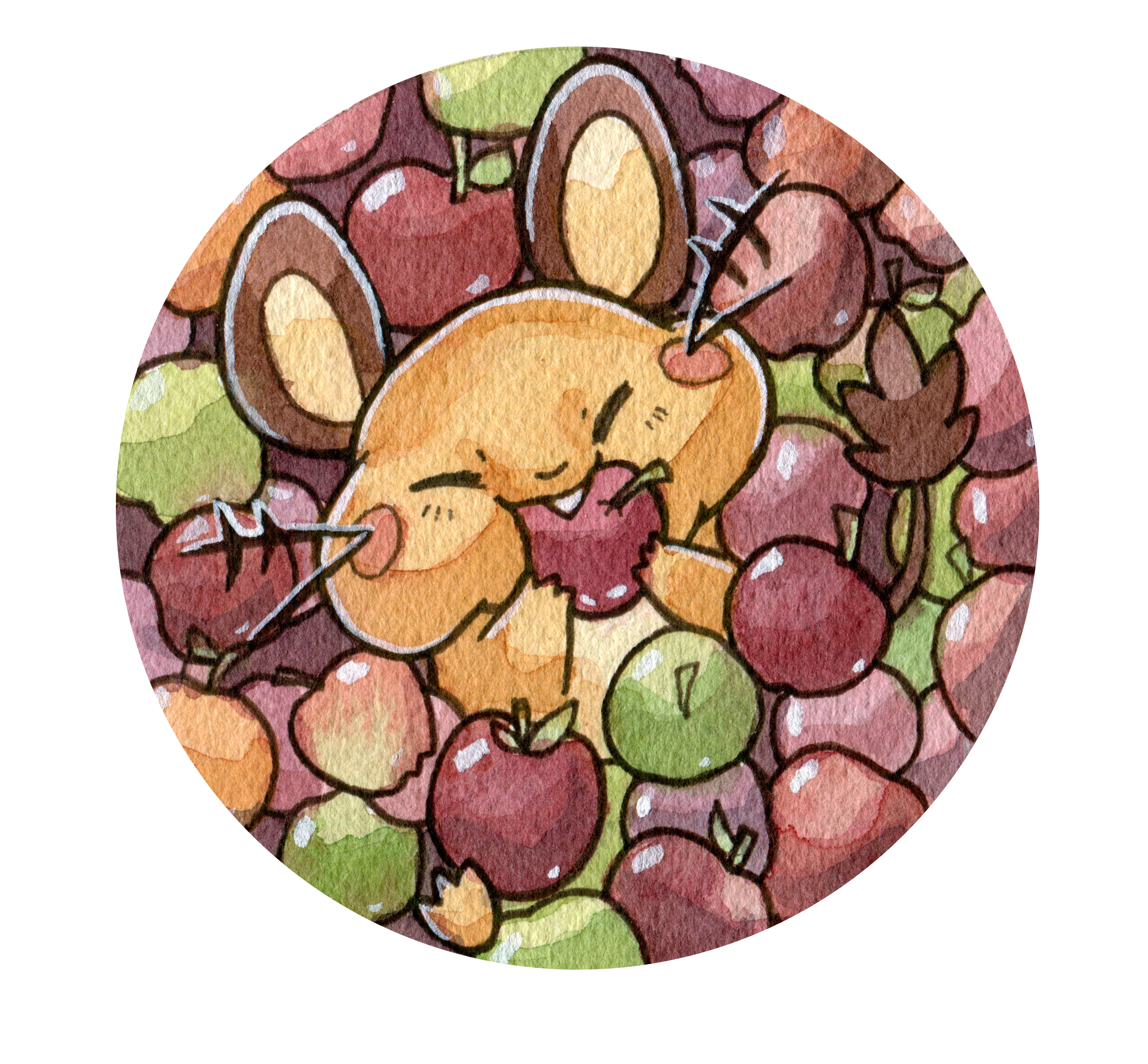 A big 2.5 inch button featuring watercolor artwork of Dedenne enjoying some autumn apples!
