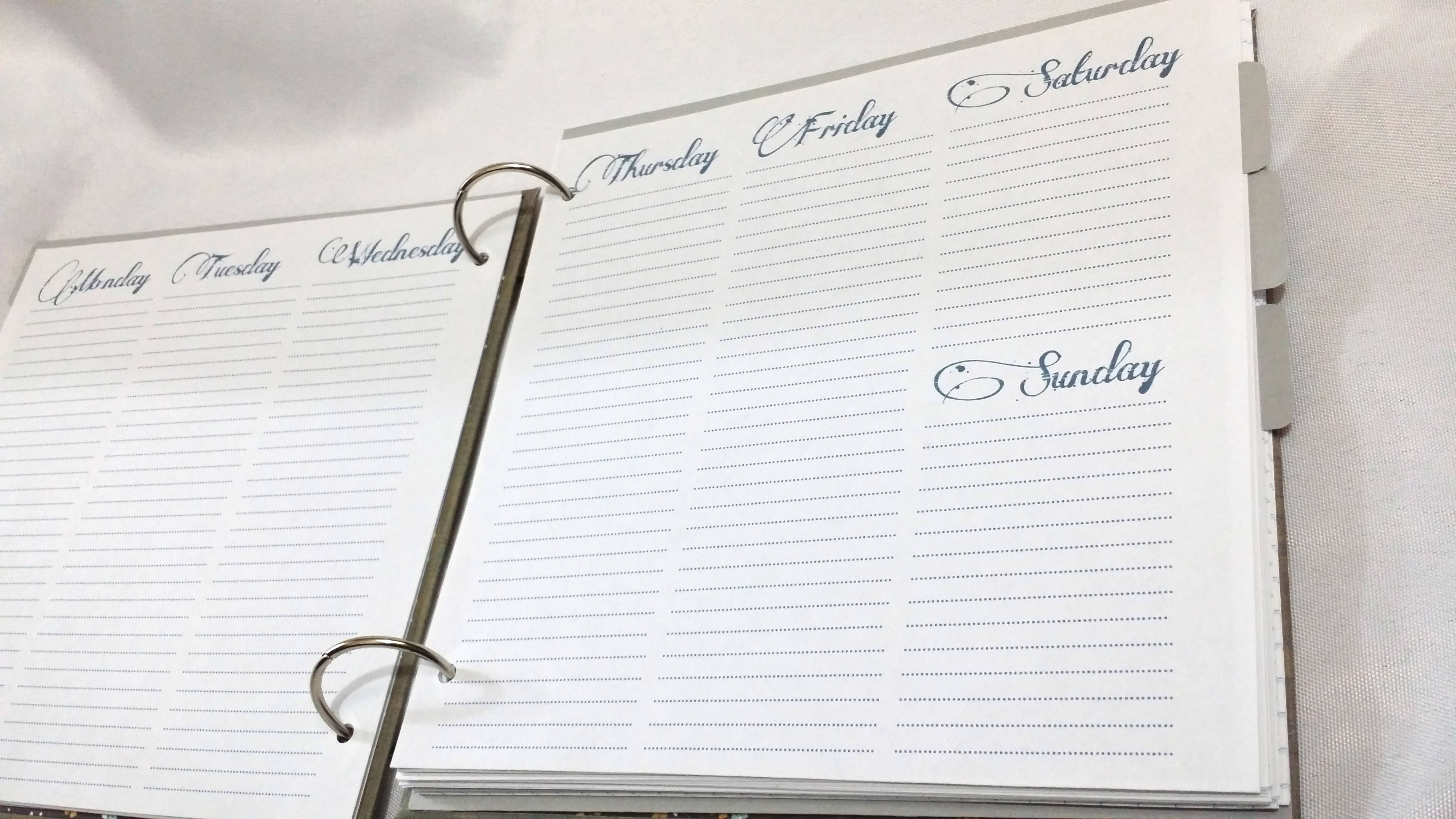 This design features a hard cover, bound with book rings so that you can expand, add, subtract pages to suit your needs. This is a sampler starter book that has a little bit of everything! And the great thing is, unlike other planners, this one doesn't expire in a year since the calendar (and all pages) can be easily removed and replaced. You can get smaller and larger book rings to suit your book's changing thickness as well. It can be your journal, memo book, calendar, daily planner, organizer, sketchbook, or scrapbook.