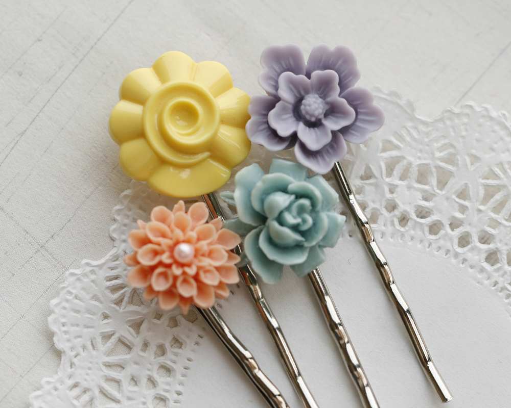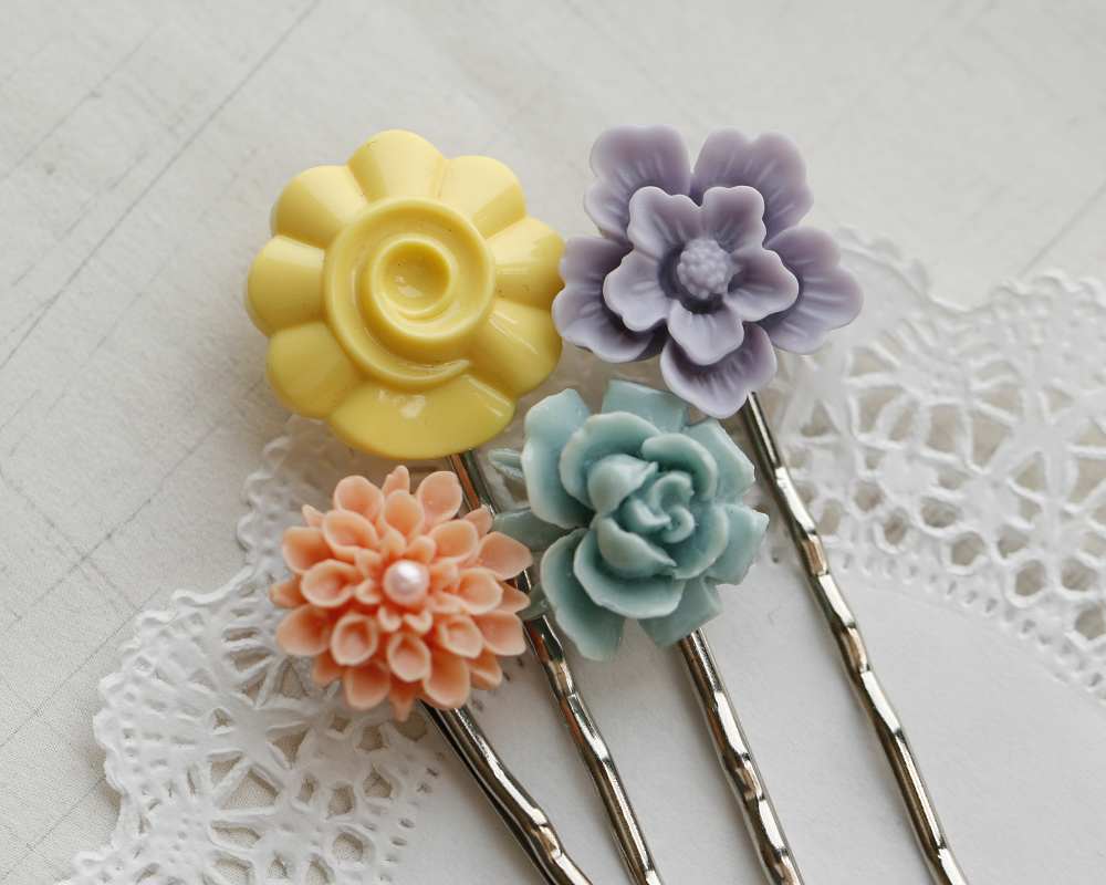you will receive all 4pcs these lovely hair pins set ~ light orange chrysanthemum with pearl (18mm) ~ purple sakura flower (20mm) ~ light blue rose flower (18mm) ~ vintage lemon yellow flower (22mm) :: flower mounted on plated hair pin :: measures 55mm (5.5cm) long :: come with gift box