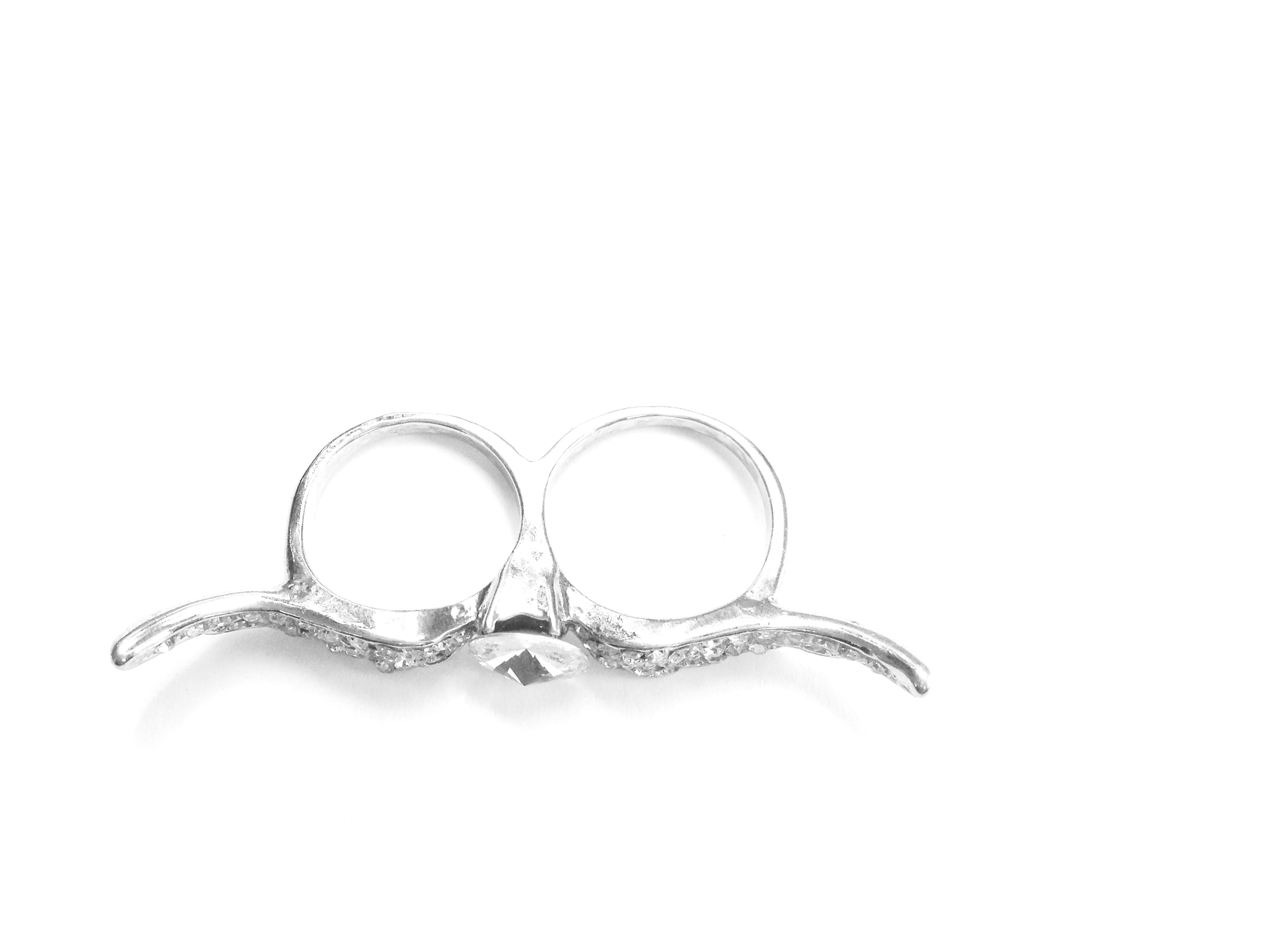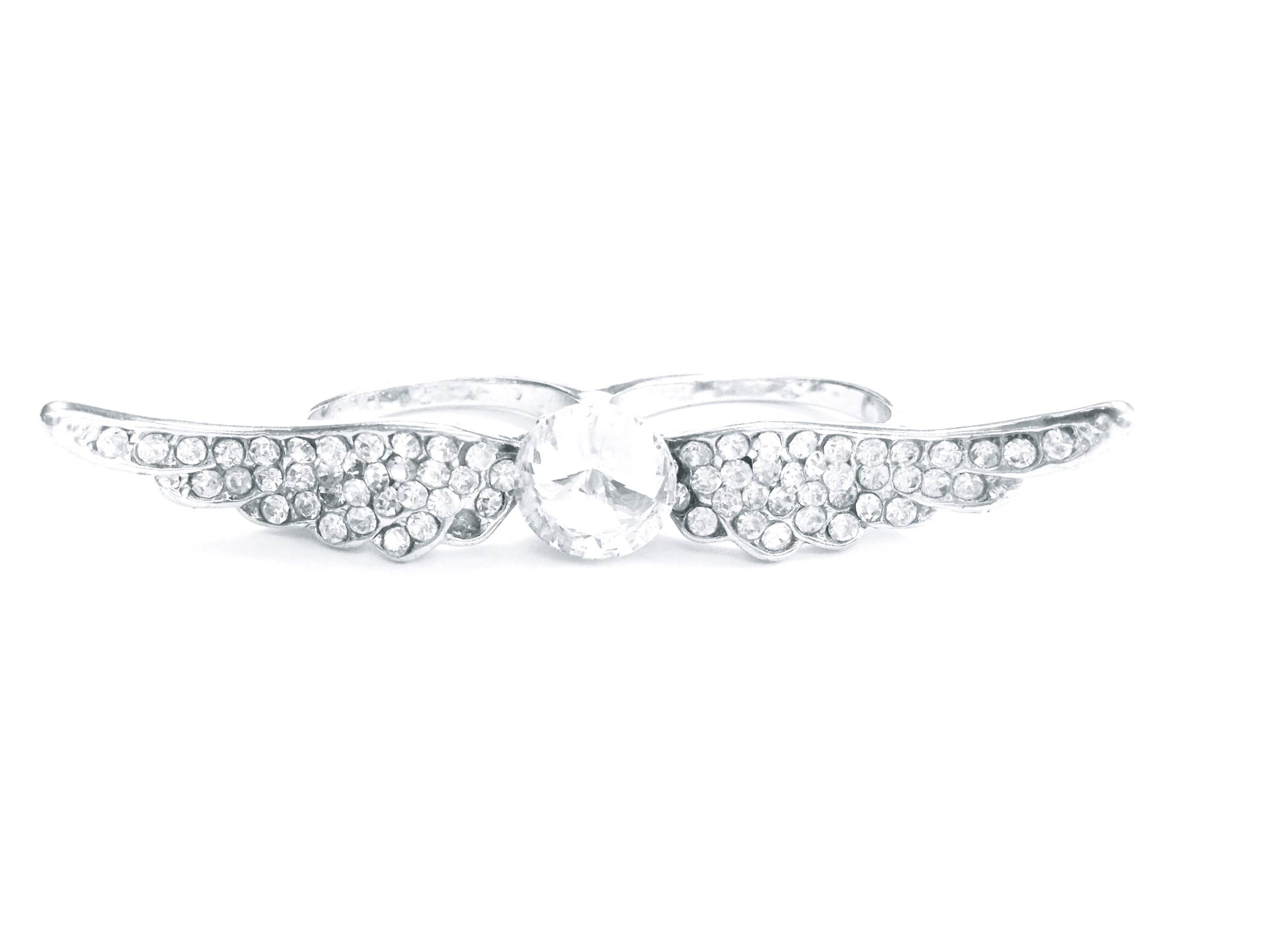 A fun and trendy silver crystal angel wings ring Two finger ring, 7,75 size. Metal alloy. Thanks for looking!
