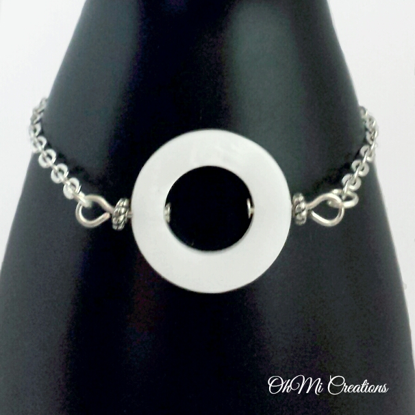 This hollow circle mother of pearl abalone shell chain bracelet is a delightful addition to any outfit. This piece has beautiful swirls in different irridescent shades of snow white. •White •Mother of Pearl abalone shell •Featured on 6 1/2" silver toned chain •Lobster clasp closure Metaphysical Properties and Meaning Believed to attract happiness and prosperity this iridescent beauty is also called Mother of Pearl. It is the lining of the inner shell that grows the Pearl. Being considered by many to be a good luck charm, abalone is a great gift for loved ones. True to its name, Mother of pearl is especially good for children due to its highly protective nature, it is also thought to encourage imagination and is said to block negative influence. Abalone has a very useful and calming nature and has been used to sooth emotions during emotionally difficult times. It has been said to bring assist with cooperation and empathy to how others feel promoting harmonious relationships.