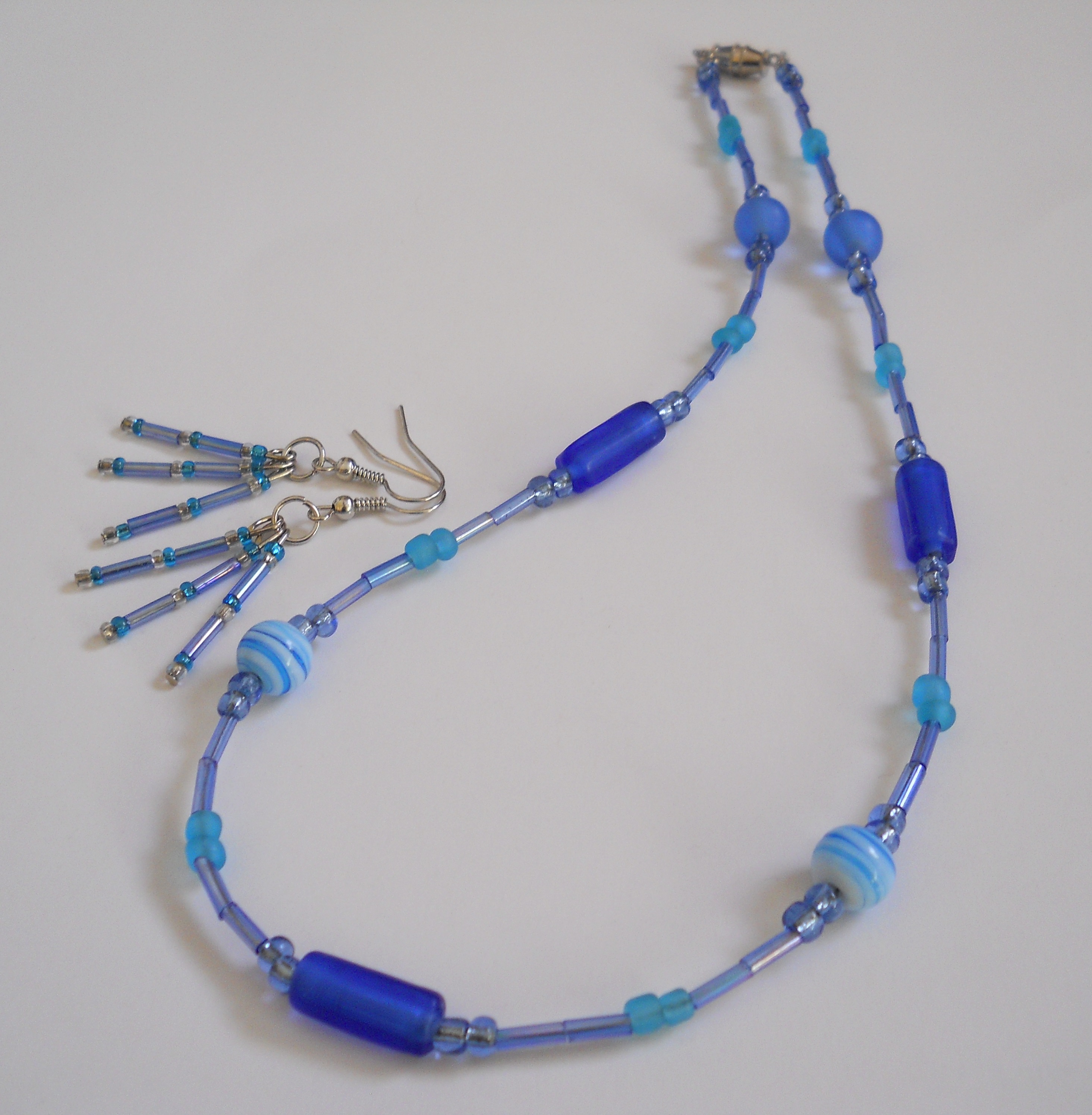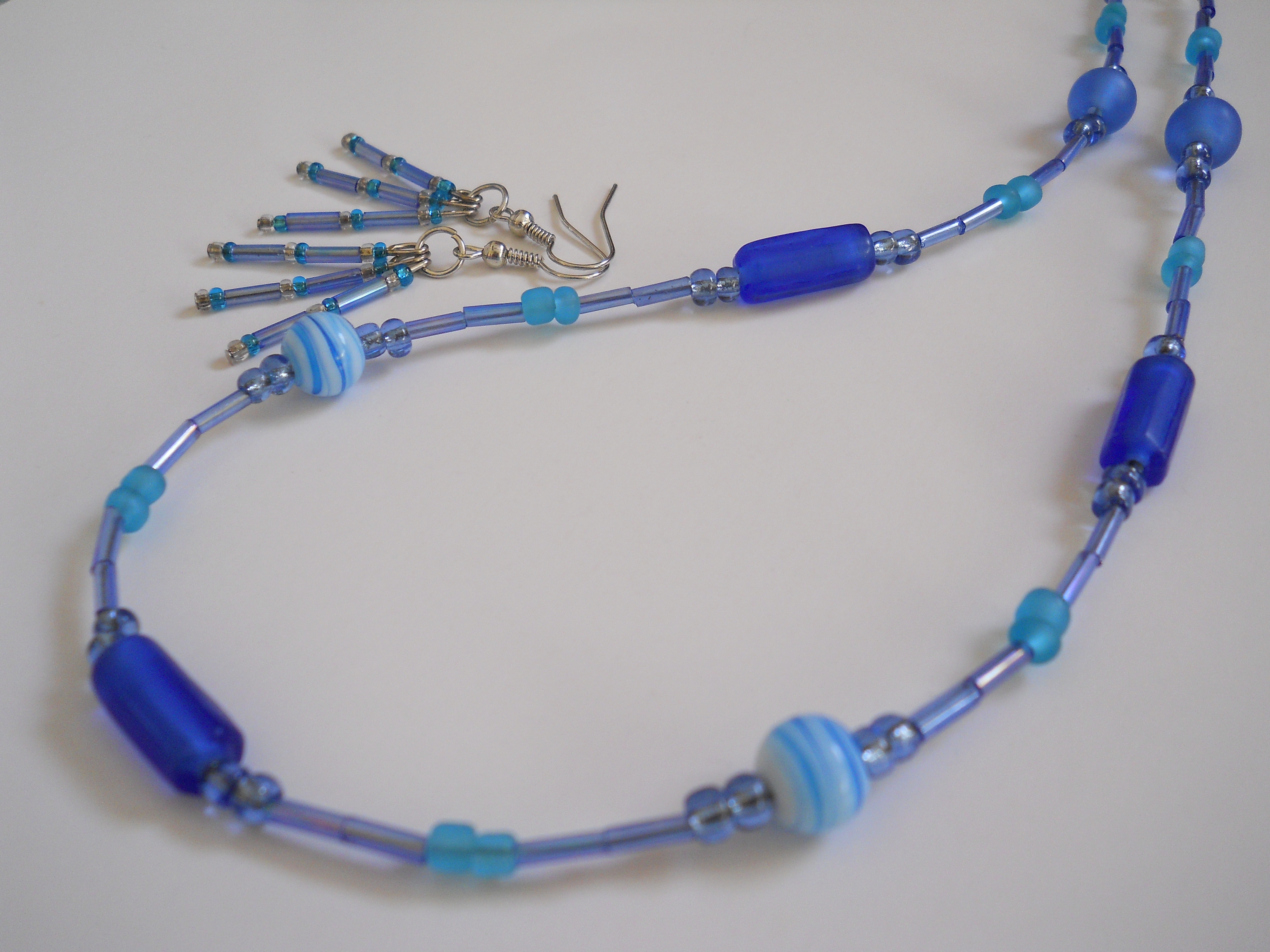 A mesmerizing shade of deep ocean blue, this stunning necklace and earrings set is all handmade with Frosted Blue and Swirl Glass Beads, Blue Bugle Beads and Frosted Czech Glass E-Beads! Necklace is connected with a Barrel Clasp and Matching Earrings with fish/french hook wire Necklace Size - 17 1/2"