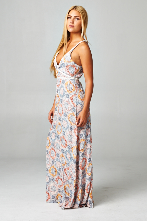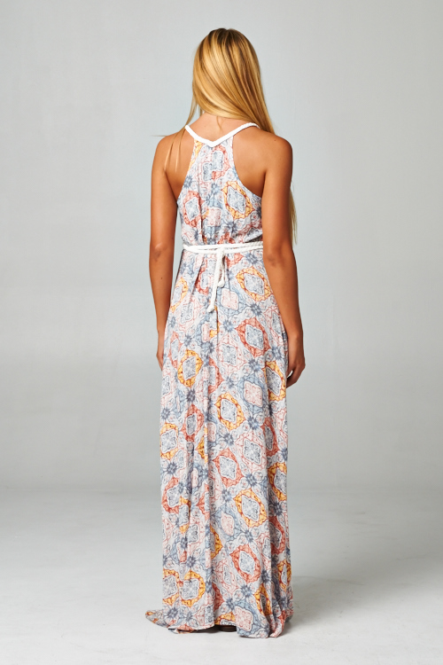 This sleeveless tapestry print maxi dress has a flowy design with braided accent trim and belted tie in the back.