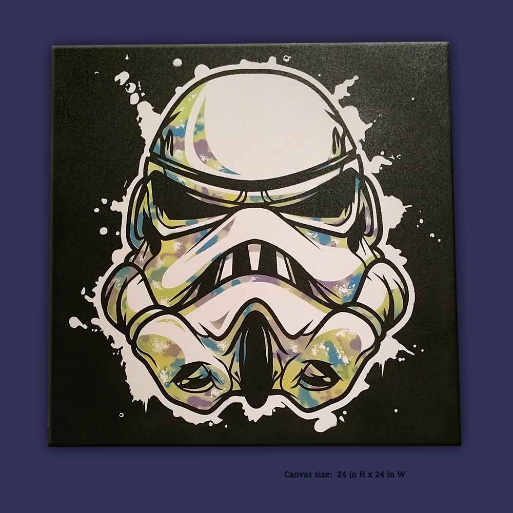 Large Storm Trooper head painted canvas Ready to ship in 3 to 5 business days. 24 x 24 inch Canvas 1 inch depth This is a stencil spray painted on canvas. This is not a print.