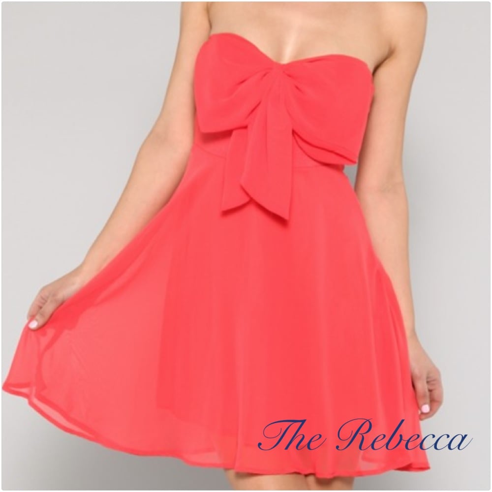 The Rebecca is a radiant coral number embellished with a flirty bow that zips in back giving it the perfect fit for your feminine physique. Charm your better half on your next date night dinner in a pair of strappy gold heels, bracelet to match, and a navy clutch. Size Chart: Small - 4 Medium - 6 Large - 8