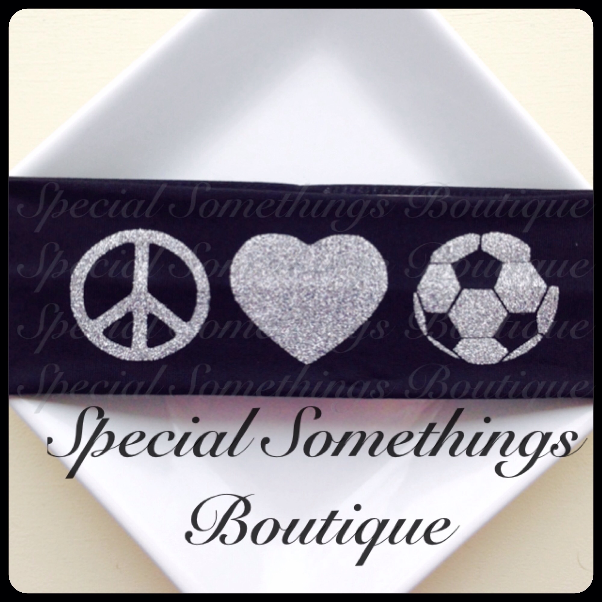 Peace, Love, Soccer Glitter Vinyl Headband Glitter vinyl of your choice (see color choices available in photos) on one size fits most soft and stretchy headband in color of your choice (see color choices available in photos) Please allow 1-2 weeks for customization