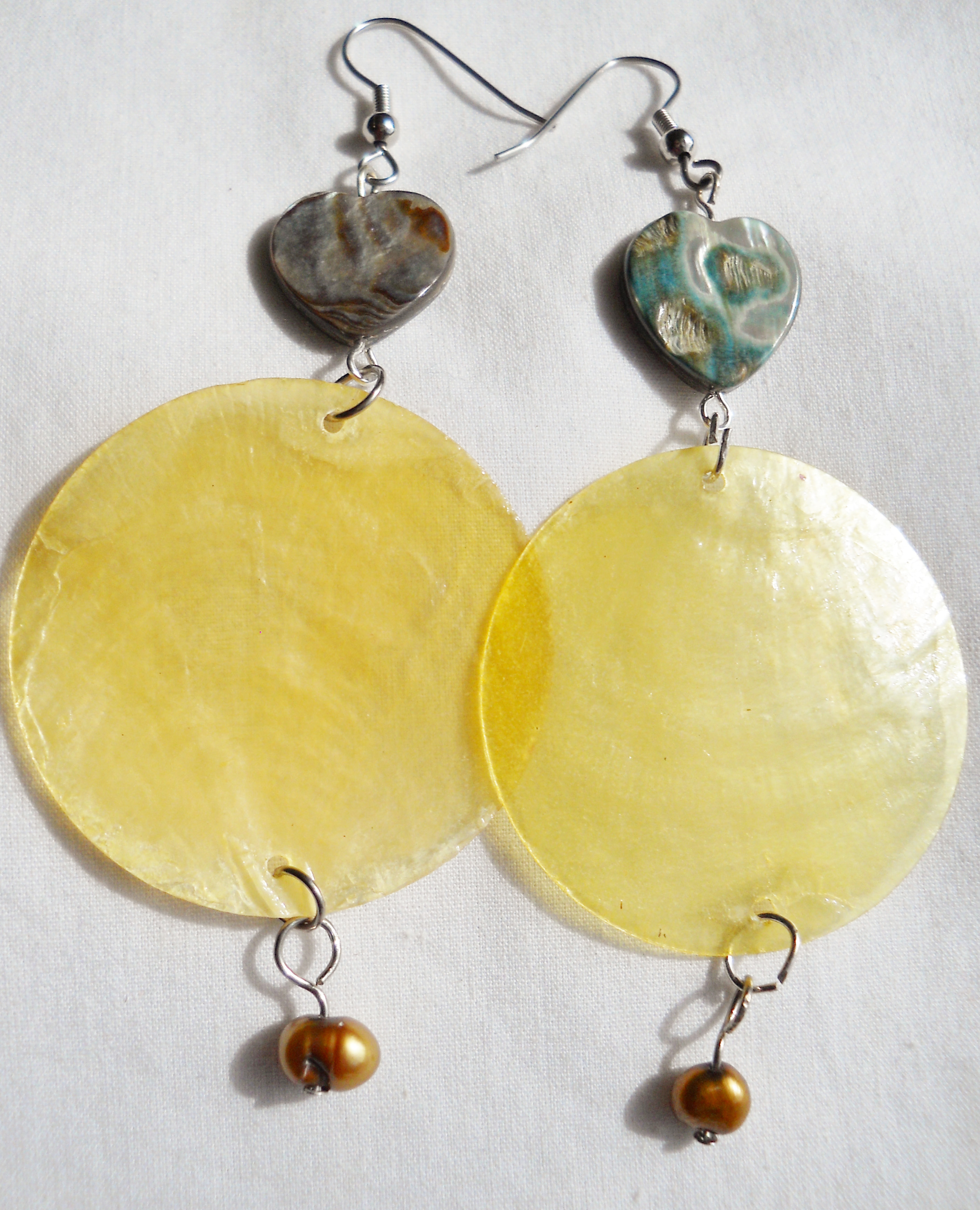 These unique little beauties hang aprox 3 1/2" from your ears. They will match with the multiple colors from the abalone hearts.