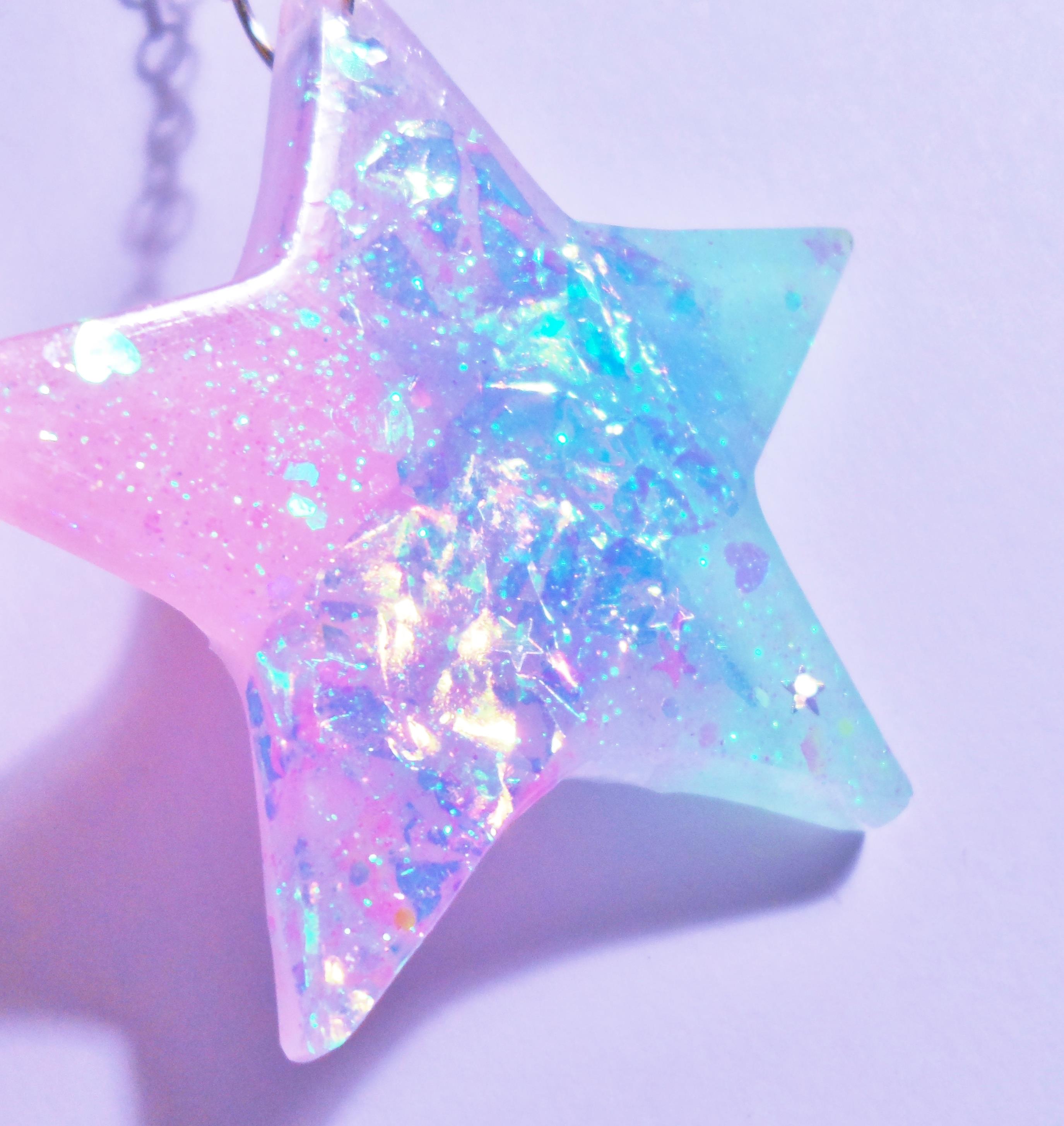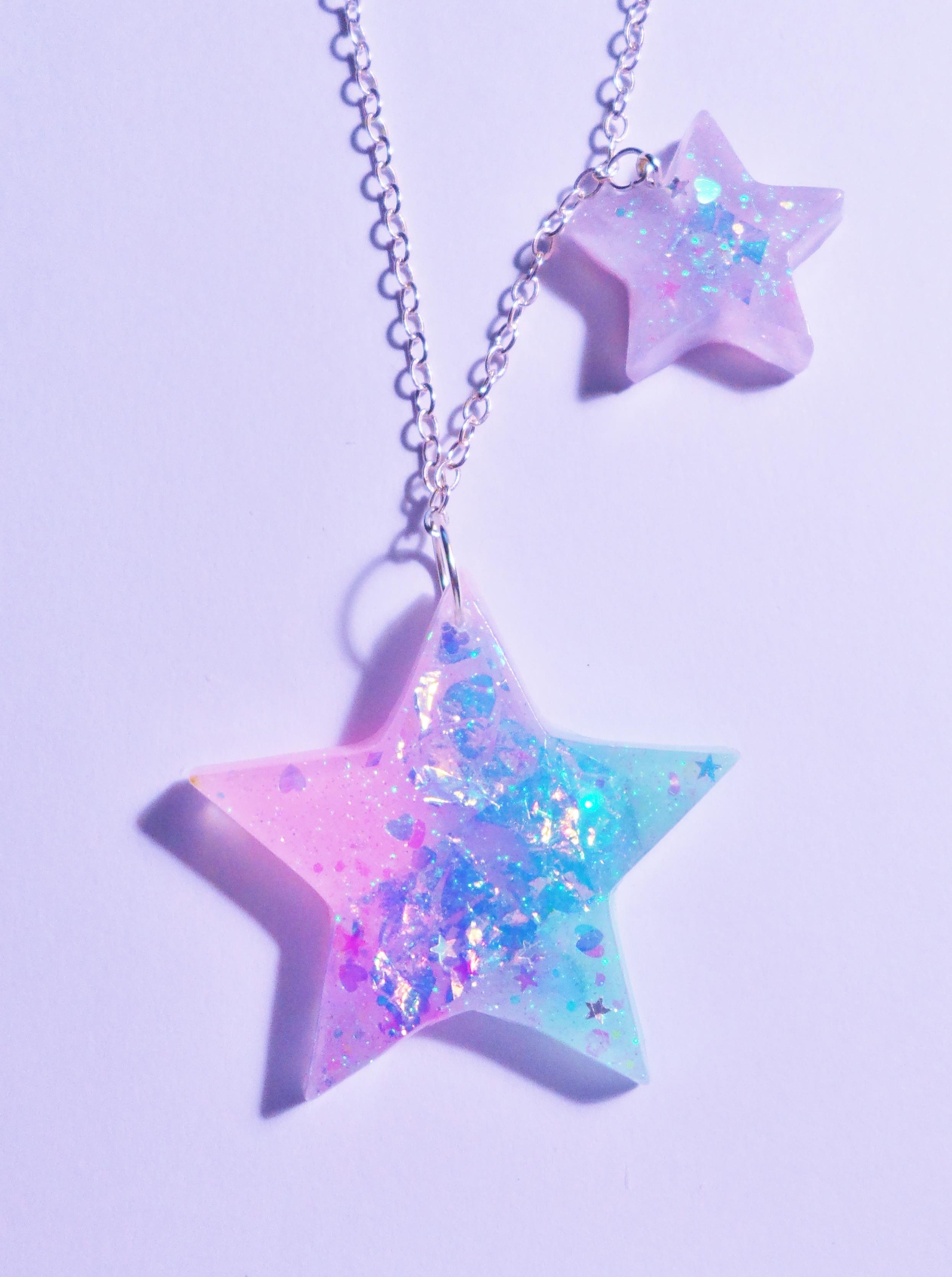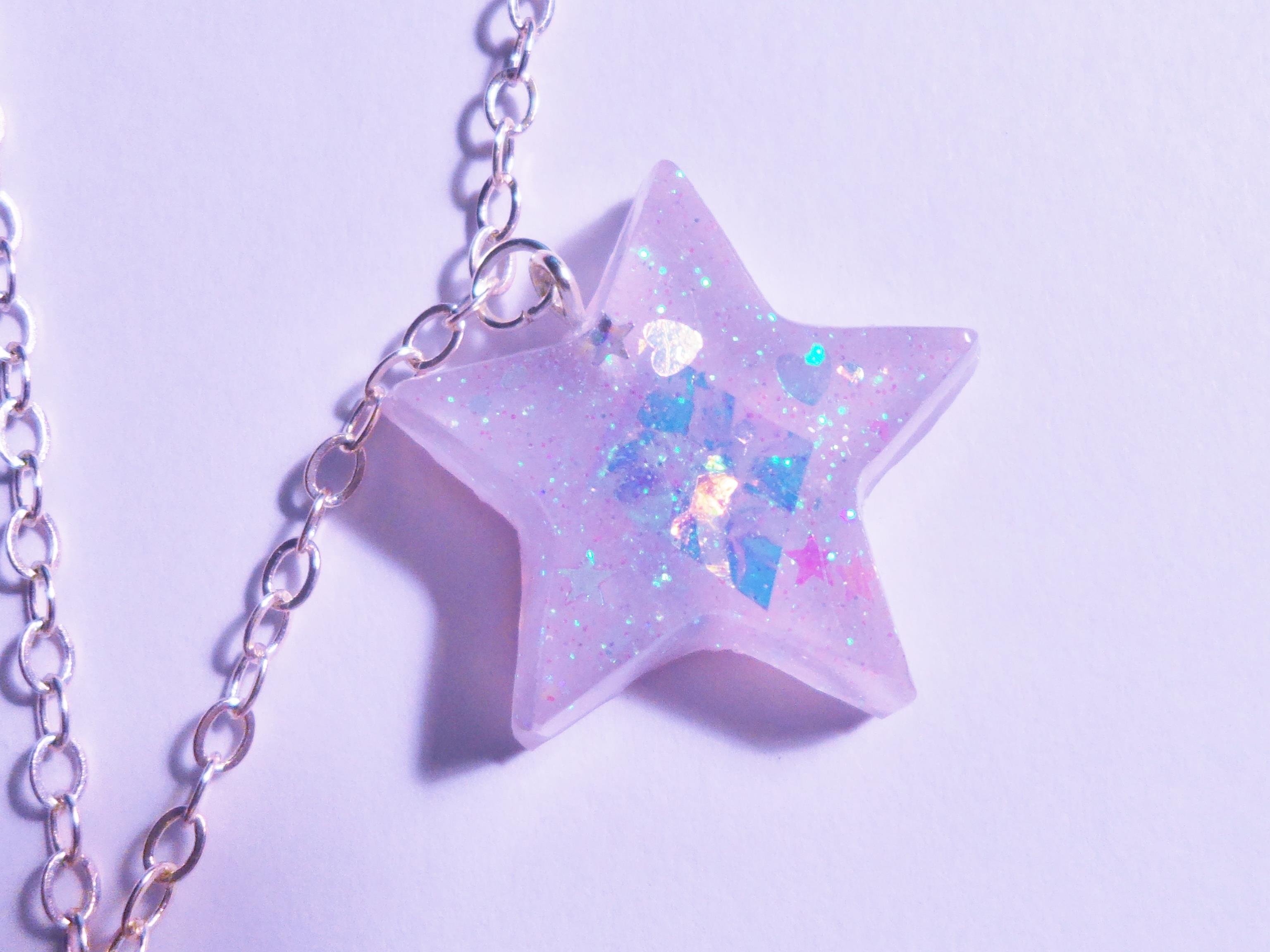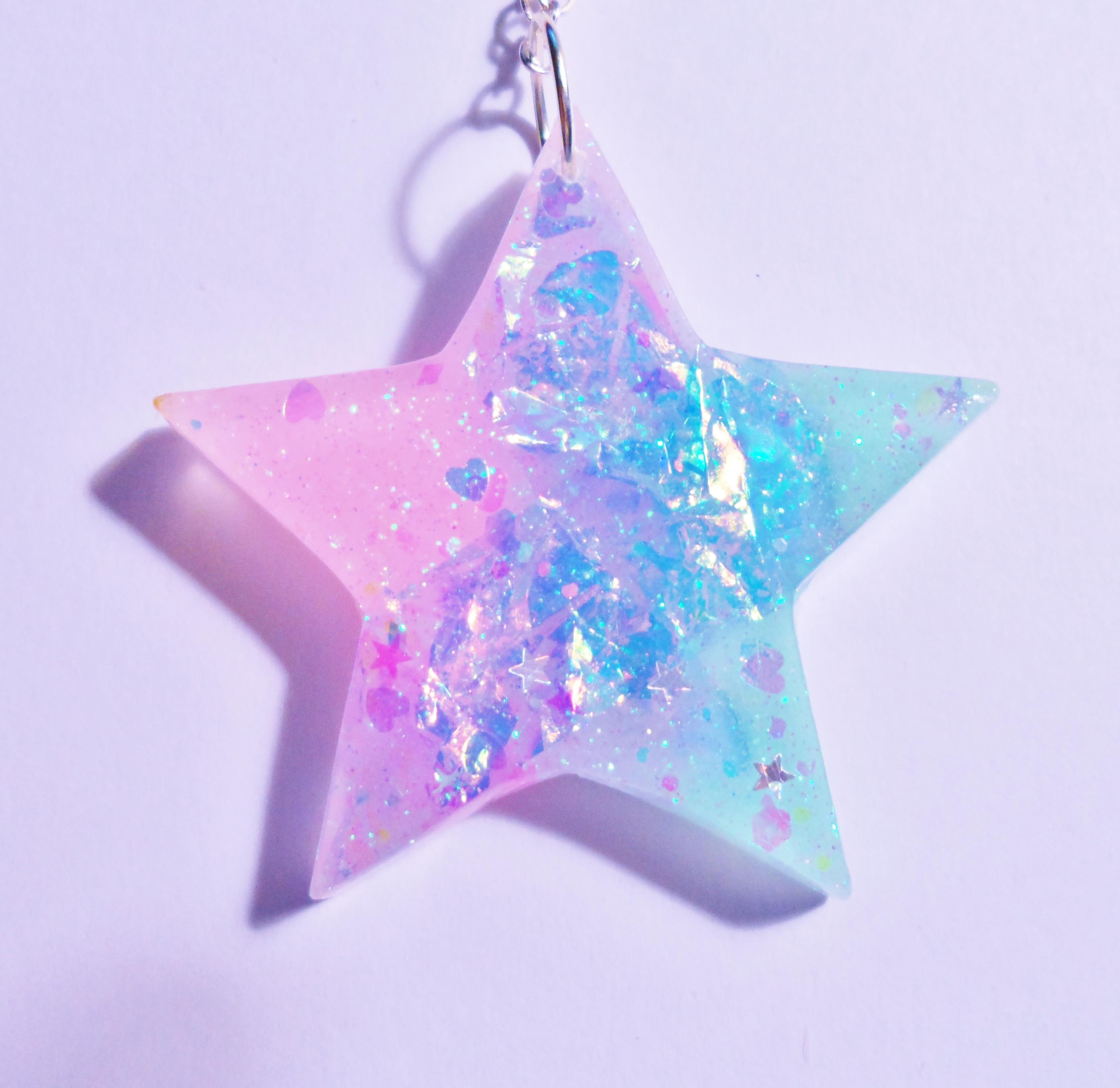 Are you a real fairy kei fairy?☆♡═━ Who could't resist this cutie shooting star fluttering by? Dazzle your kawaii outfit with this stardust necklace! ☆彡Handmade from Epoxy Resin ☆彡2 1/4" star pendant ☆彡Holographic and iridescent ☆彡Hypoallergenic metal chain with accent resin star charm and lobster clasp All orders come with a free gift! ✩ヾ(*´∀`*)ノ ☆彡 For more cutie cosmic stuff, please visit: http://pastelgalaxyz.storenvy.com/ http://pastel-galaxyz.tumblr.com/ https://www.facebook.com/PastelGalaxyz ˚•⋆˒๑•♪*