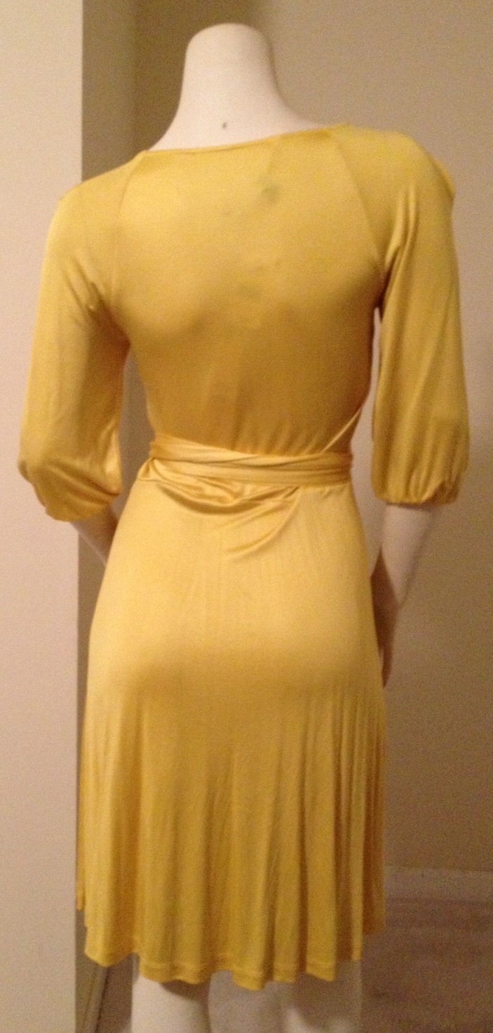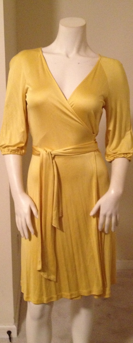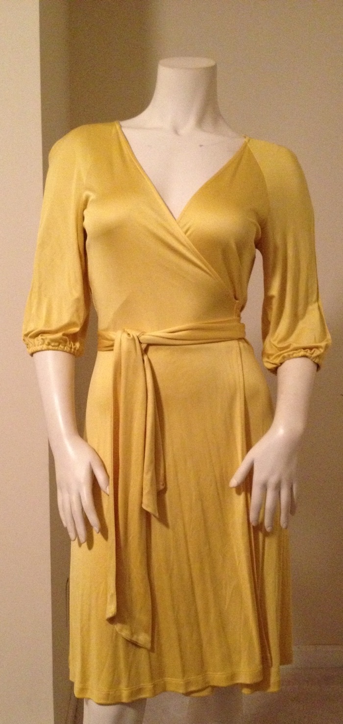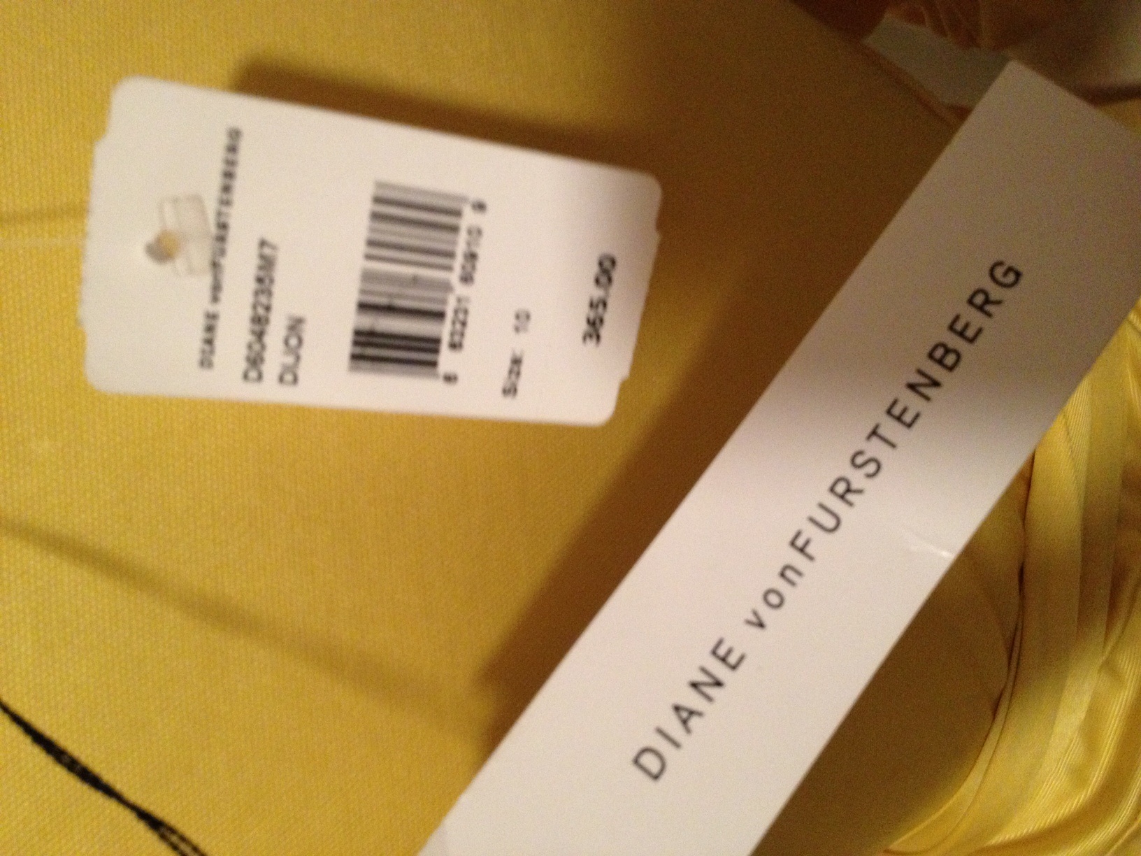 Perfect for spring, this yellow DVF wrap dress comes with tags attached. Lightweight material and pristine condition. Due to storage, dress may need to be dry cleaned.