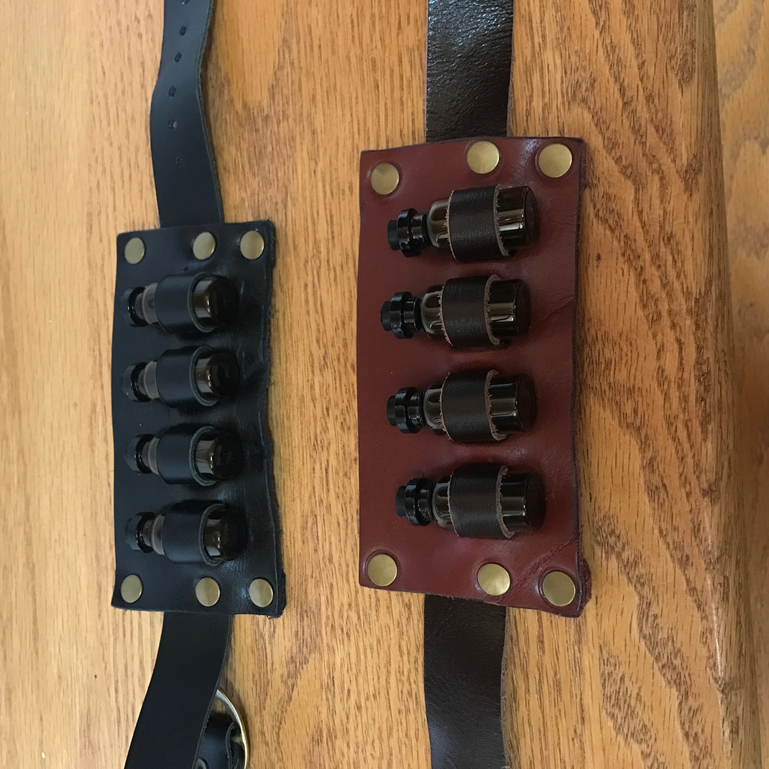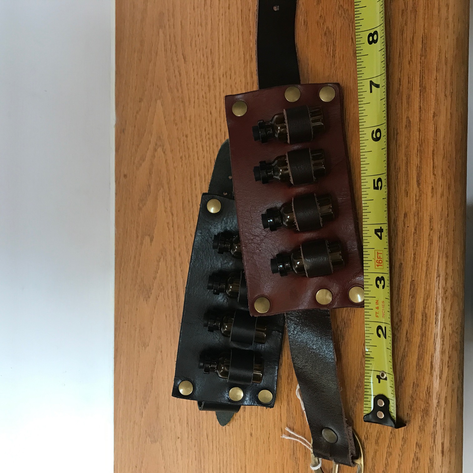 Handmade leather armband with 4 tiny bottles. The bottles are dark glass with rubber stoppers. The armband has an adjustable buckle strap and comes in black or dark brown.