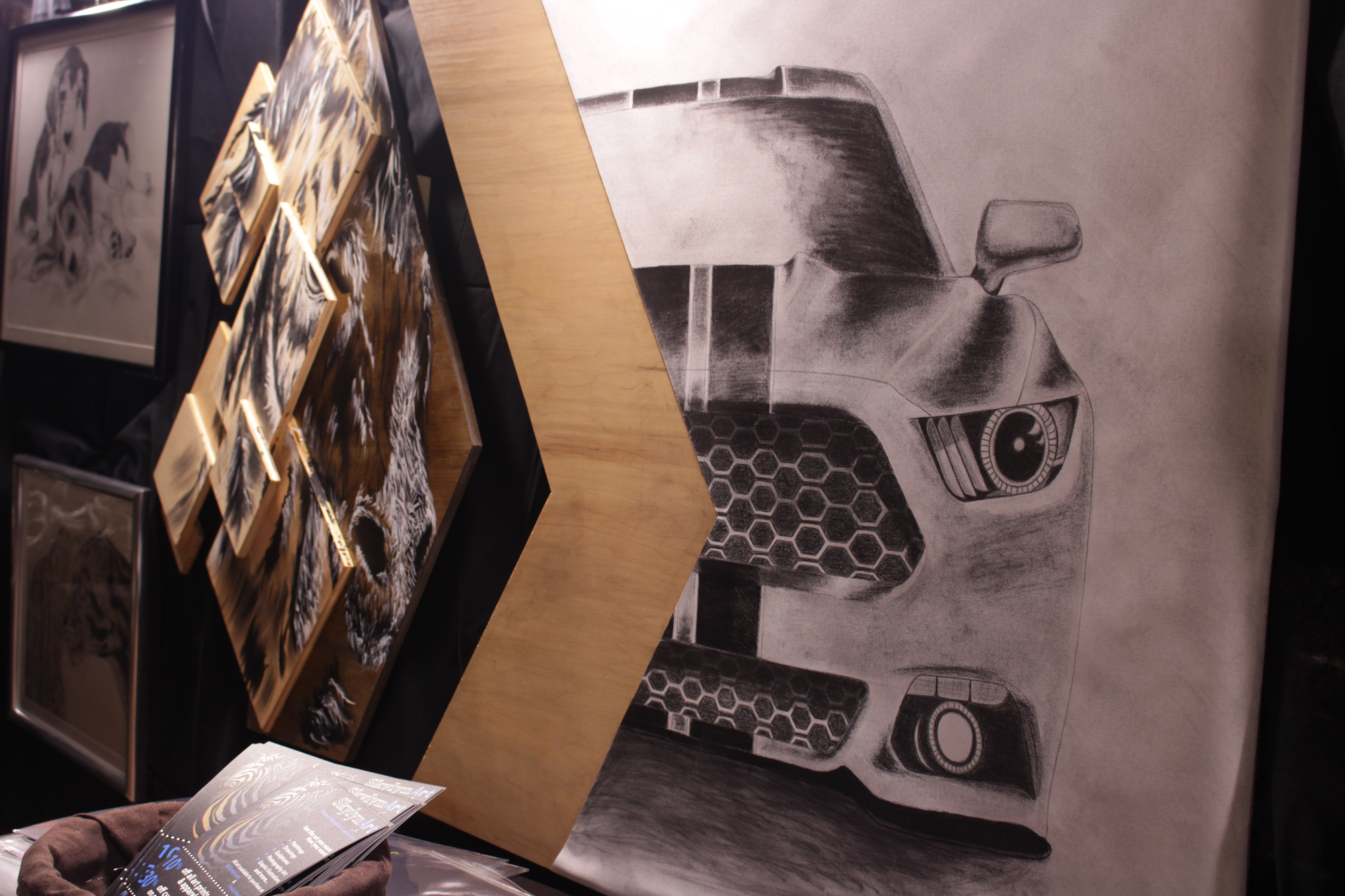 Featured at Shadowbox Live Theater (RAW) Two pieces of art that can connect together or be separated (sold together as one piece) Total Dimensions (both pieces side by side/connected) 72" x 36" x 2" Note artwork weight (around 10-12 lbs) Acrylic paint on wood and charcoal drawing wall mounted sculpture Stained wood Ready To Hang