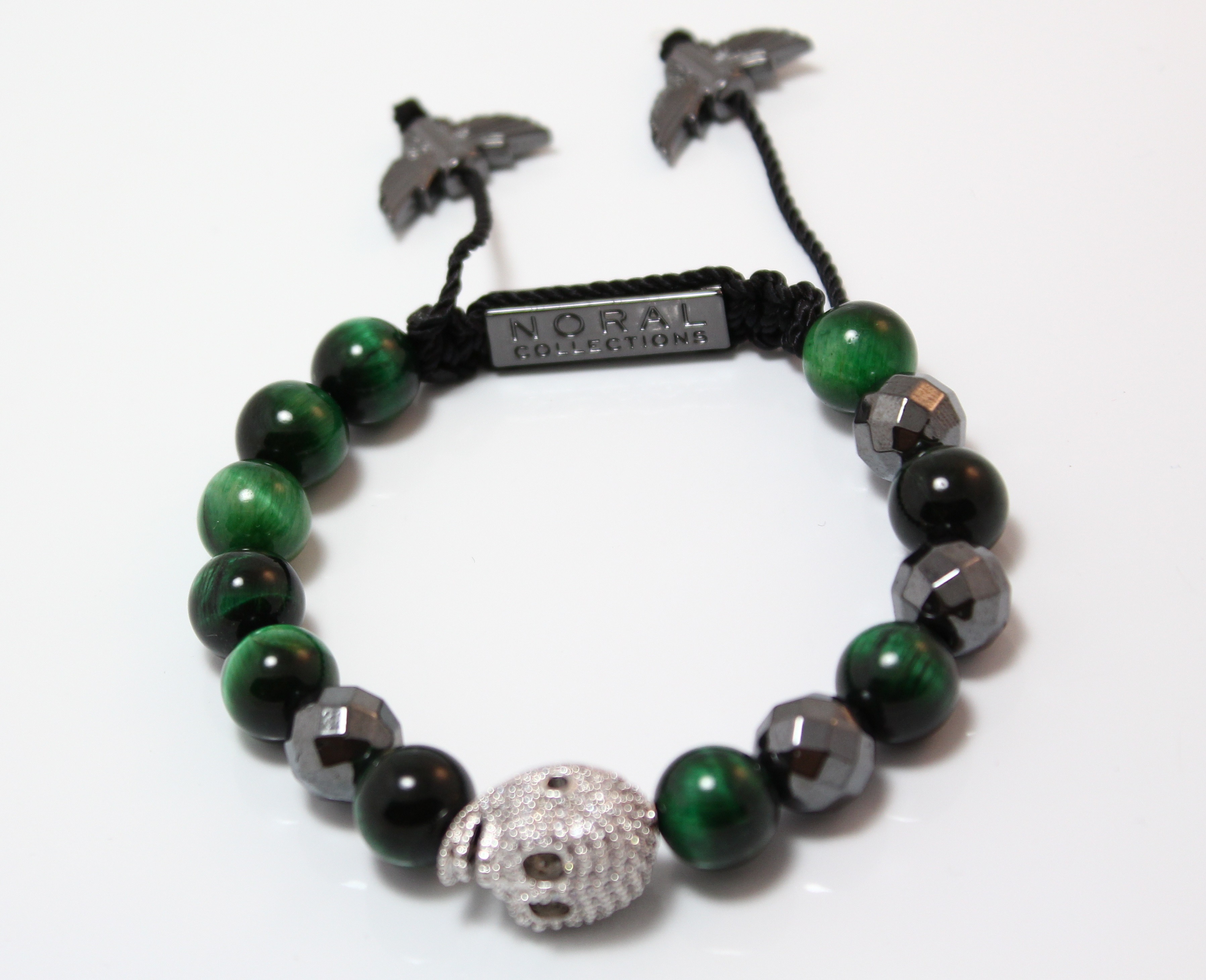 CZ DIAMOND SILVER SKULL WITH GREEN TIGER EYE AND HEMATITE BRACELET-1