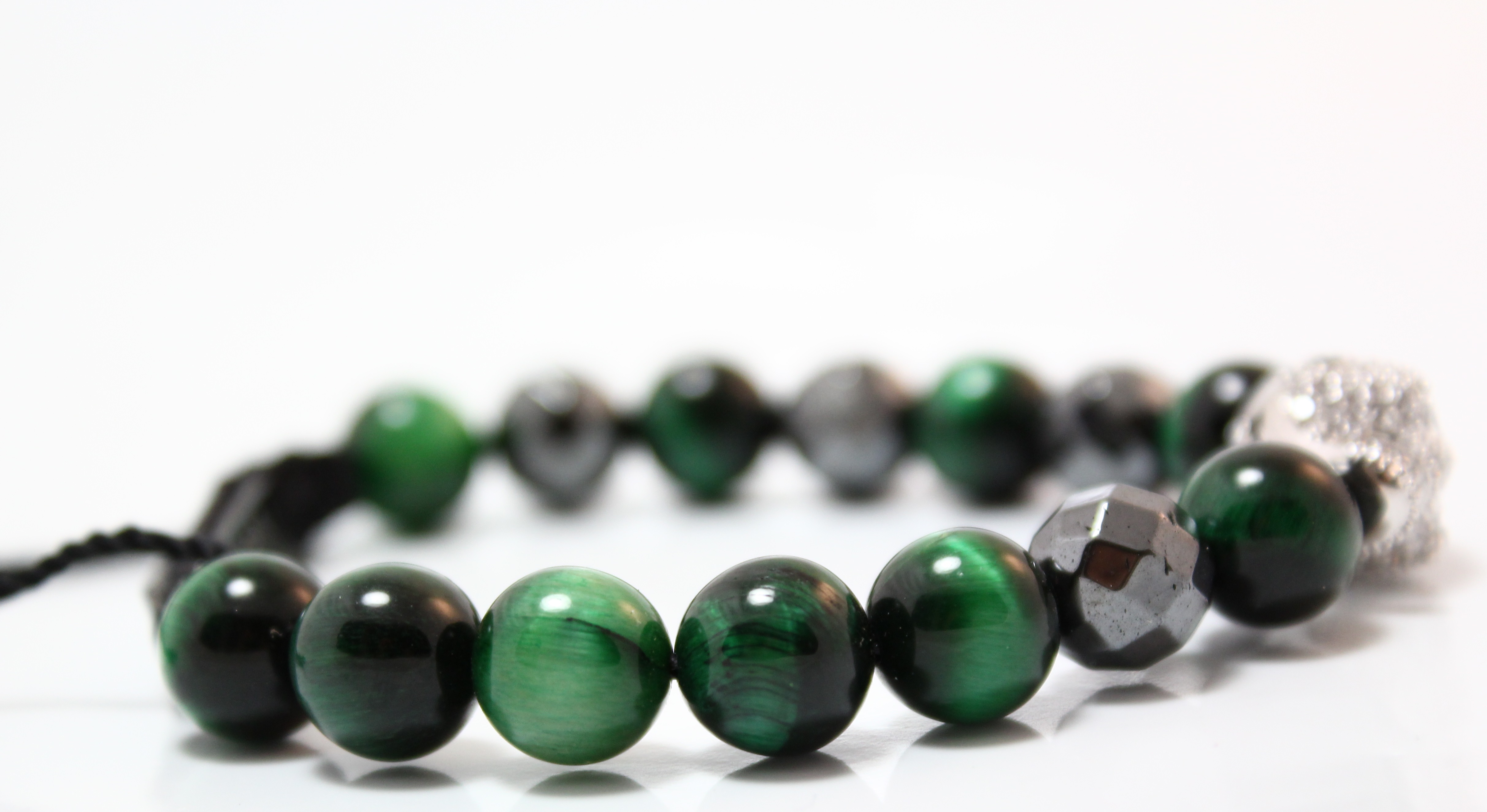 100% HANDMADE, ADJUSTABLE *12MM SILVER CZ DIAMOND SKULL *10MM GREEN TIGER EYE *10MM FACETED HEMATITE - *GREEN TIGER-PERSPECTIVE,FACE SITUATIONS,RELIEVES PAIN *HEMATITE-STABILITY,GROUNDING, AND COURAGE *SILVER-EMOTION,WEALTH, AND PROSPERITY