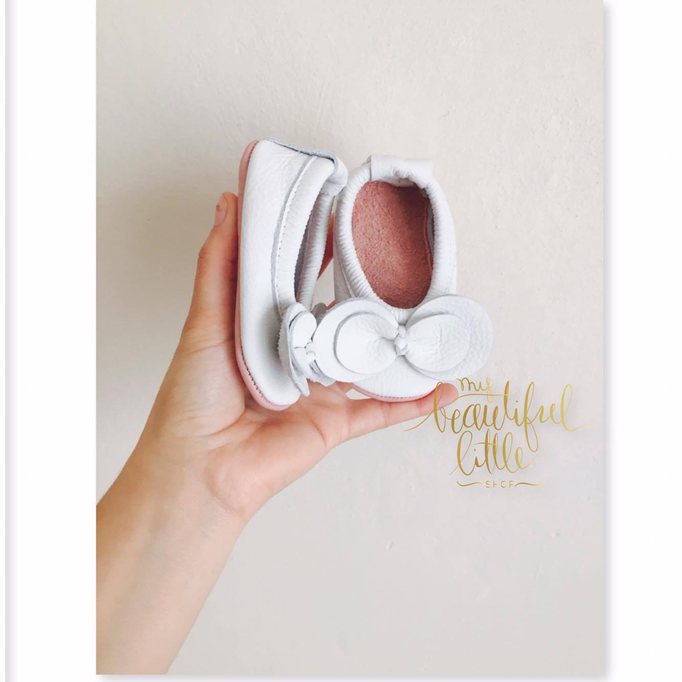 In this listing you have the option to purchase the white flat style with a big double bow option and pink soles. NON WALKERS SOLES