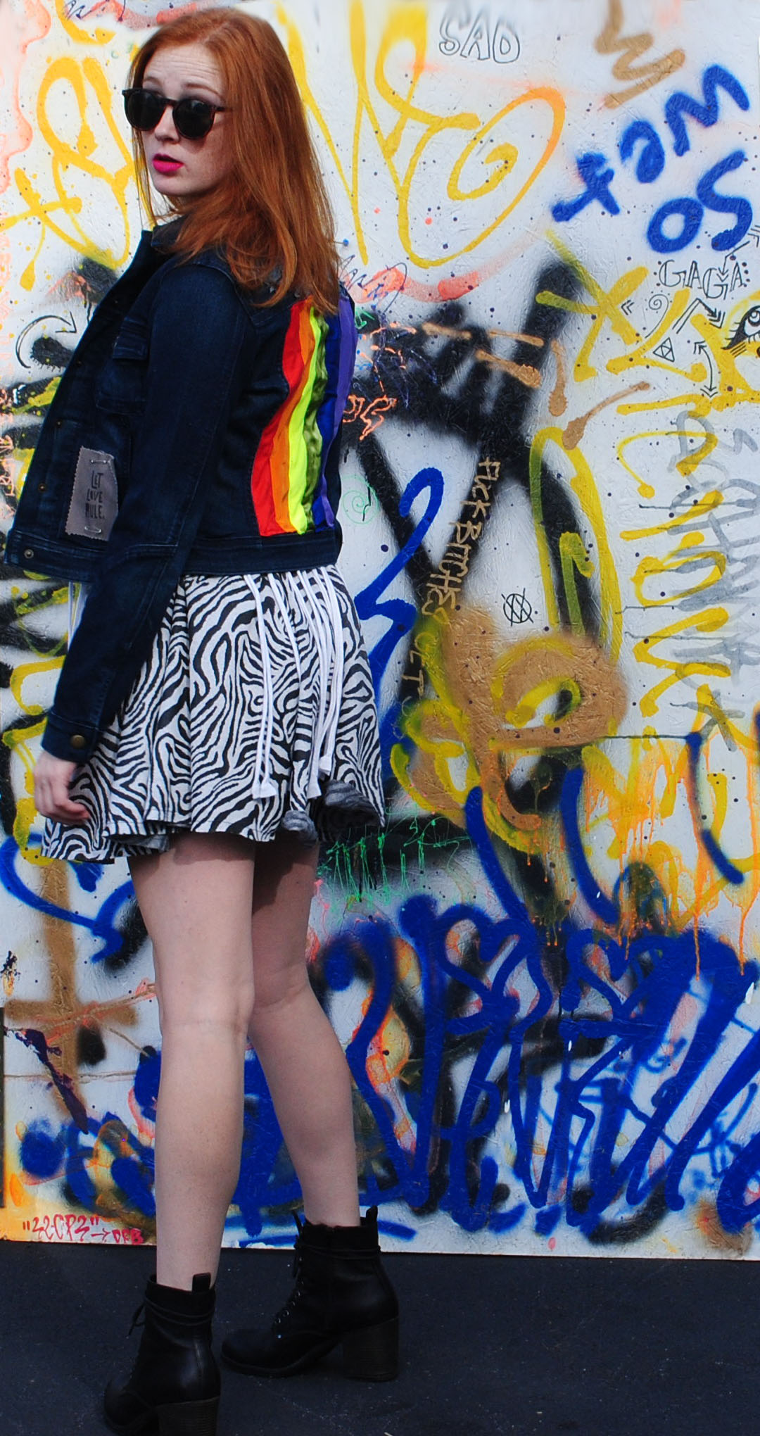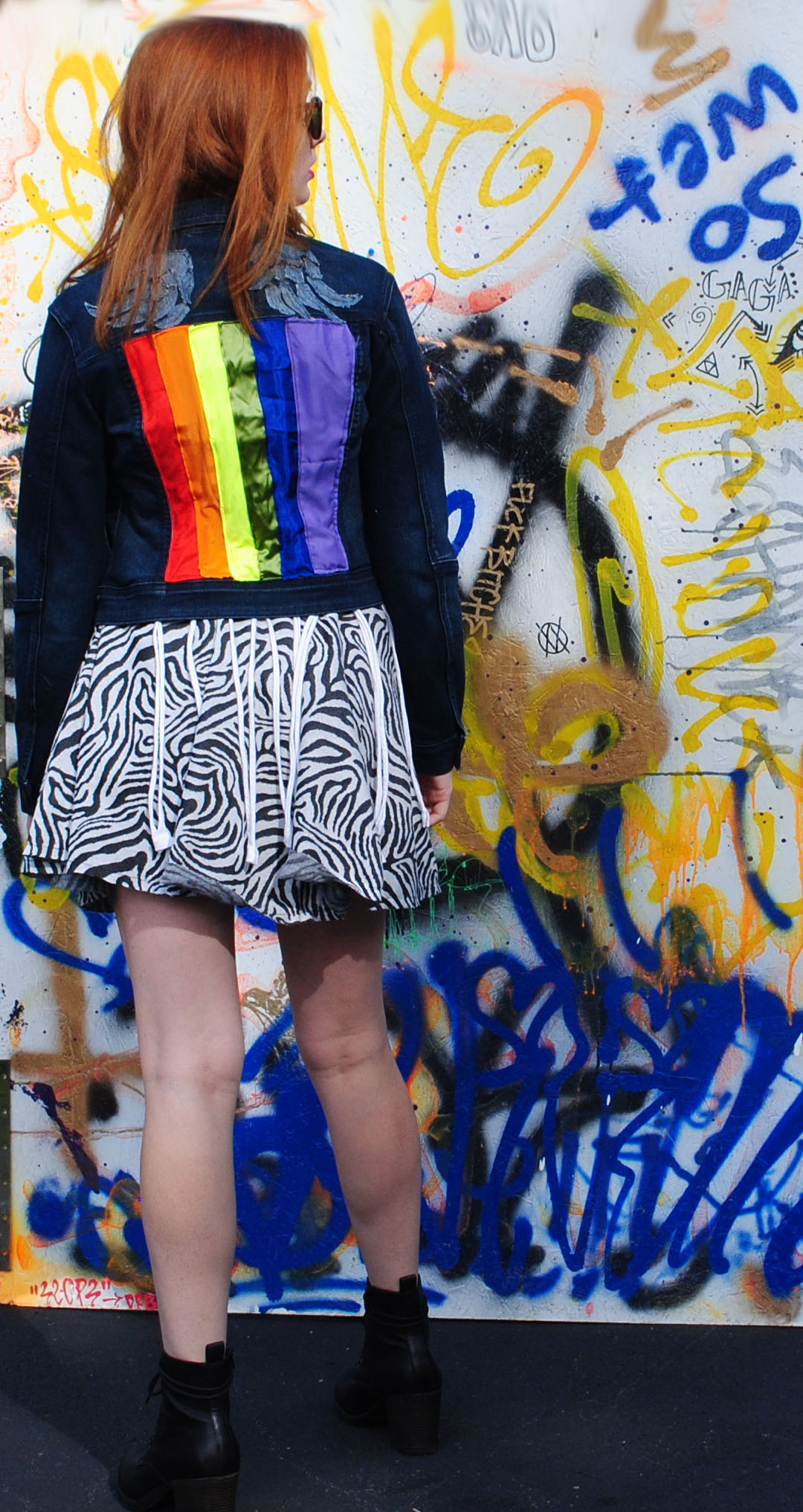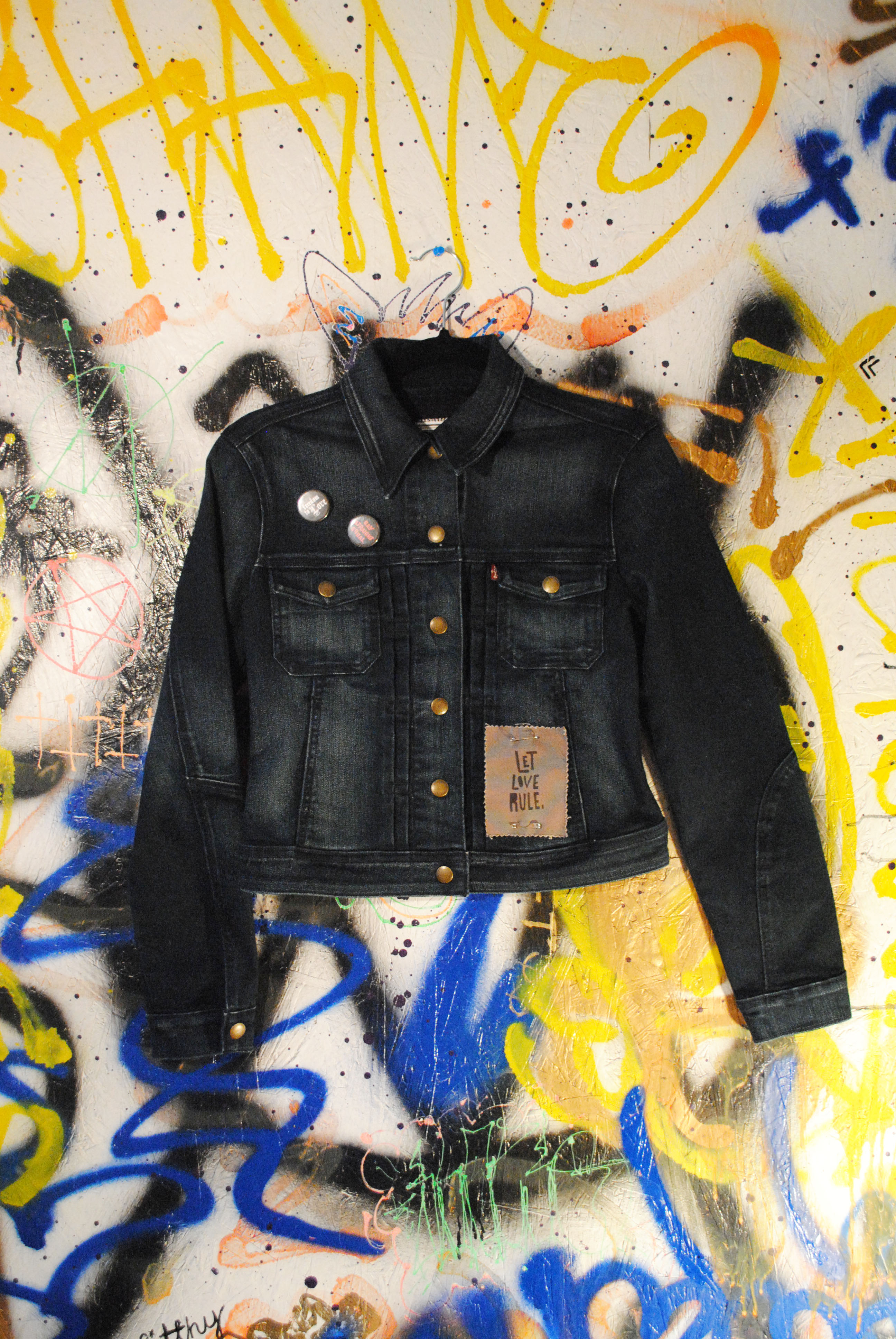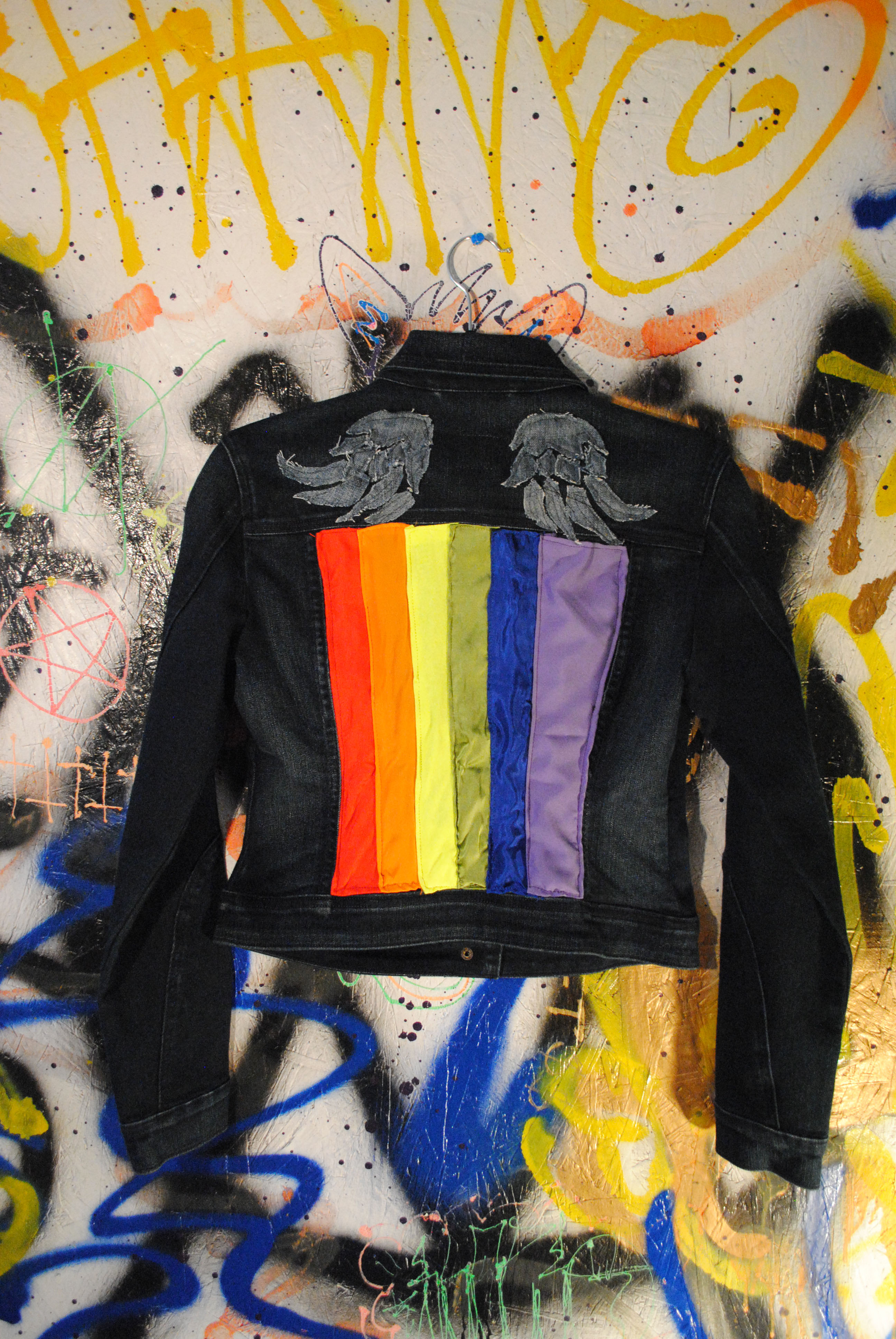 This hand-made, one-of-a-kind, up-cycled Levi's denim jacket features pins and a patch by Rainbow Alternative on the front. "Freedom to Love","Gay, Straight, Equal" & "Let Love Rule". The back features denim wings above a fabric rainbow. Size Small Hand-made & designed in Philadelphia, PA