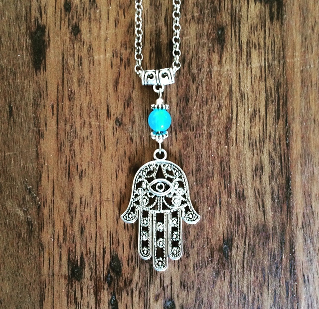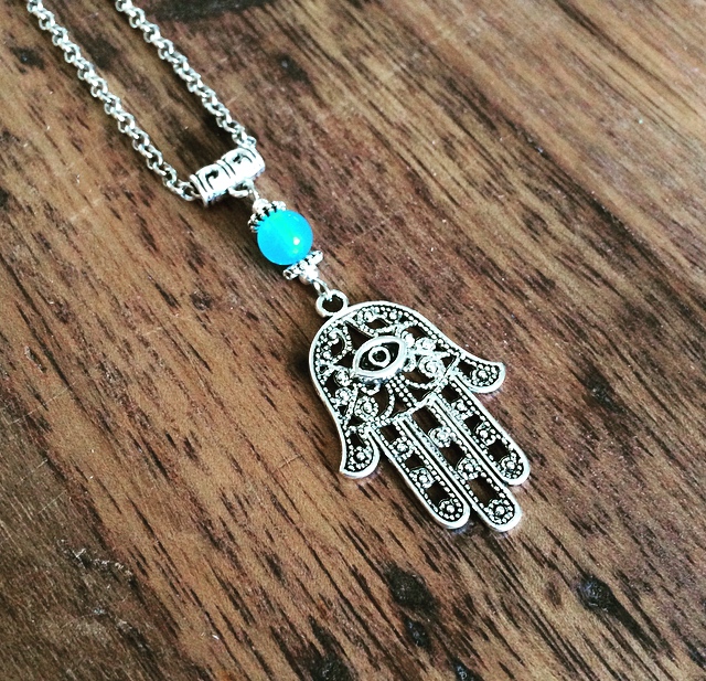 Long hamsa necklace measures around 15 inches long. Large hamsa measures 1 1/2 inches.