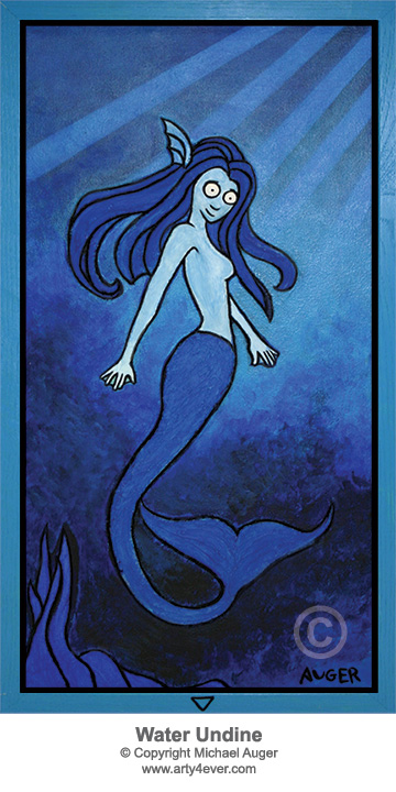 The Water Undine (or mermaid) is a fish-like creature with a beautiful voice. They are found most often in forest pools and waterfalls. This original blacklight-reactive acrylic on canvas painting is a large 11 inches wide by 21 inches tall. Also included is a hand painted wood frame branded with the elemental's magical symbol.
