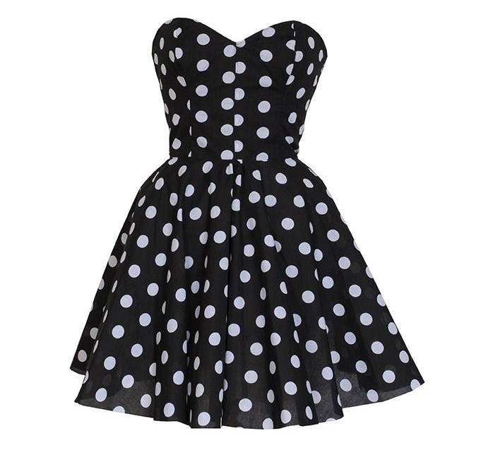Strapless 50s inspired black Polka Dot Party Dress . This stunning pin up dress comes in a black and white polka dot print.