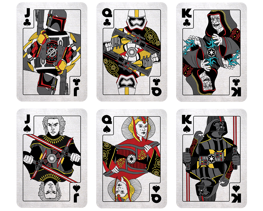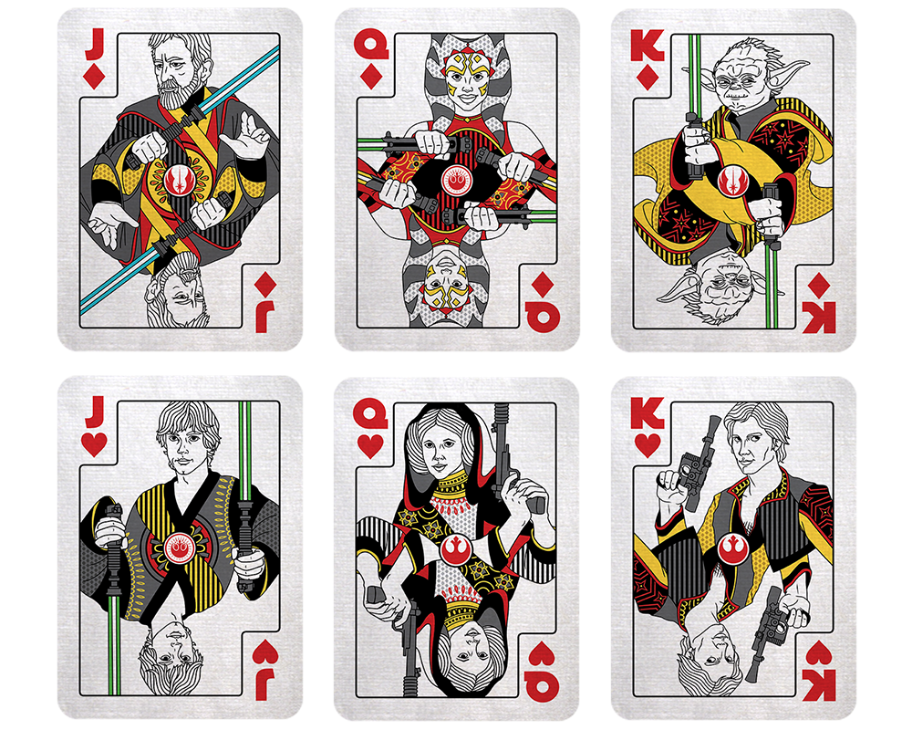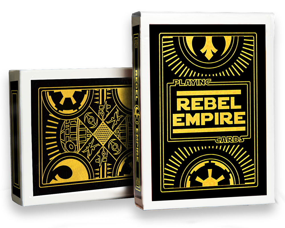 Rebel Empire is a fan art playing card deck featuring characters from the Star Wars films and the Star Wars expanded universe. This deck comes with the standard 52 playing cards and 2 joker cards, as well as a custom designed tuck box. The characters included in this deck are: Han Solo, Leia Organa, Luke Skywalker, Yoda, Ahsoka Tano, Obi Wan Kenobi, Palpatine, Captain Phasma, Boba Fett, Darth Vader, Padme Amidala, Kylo Ren, Chewbacca, R2D2 and C3PO Rebel Empire playing cards are printed on high quality water resistant card stock. They are smooth to the touch, great for shuffling, and are standard poker size. You can get an up close view of these cards as well as process videos and other content at my blog. Rebel Empire is a fan art creation. Star Wars and all of its characters and iconography belong to LucasFilms.