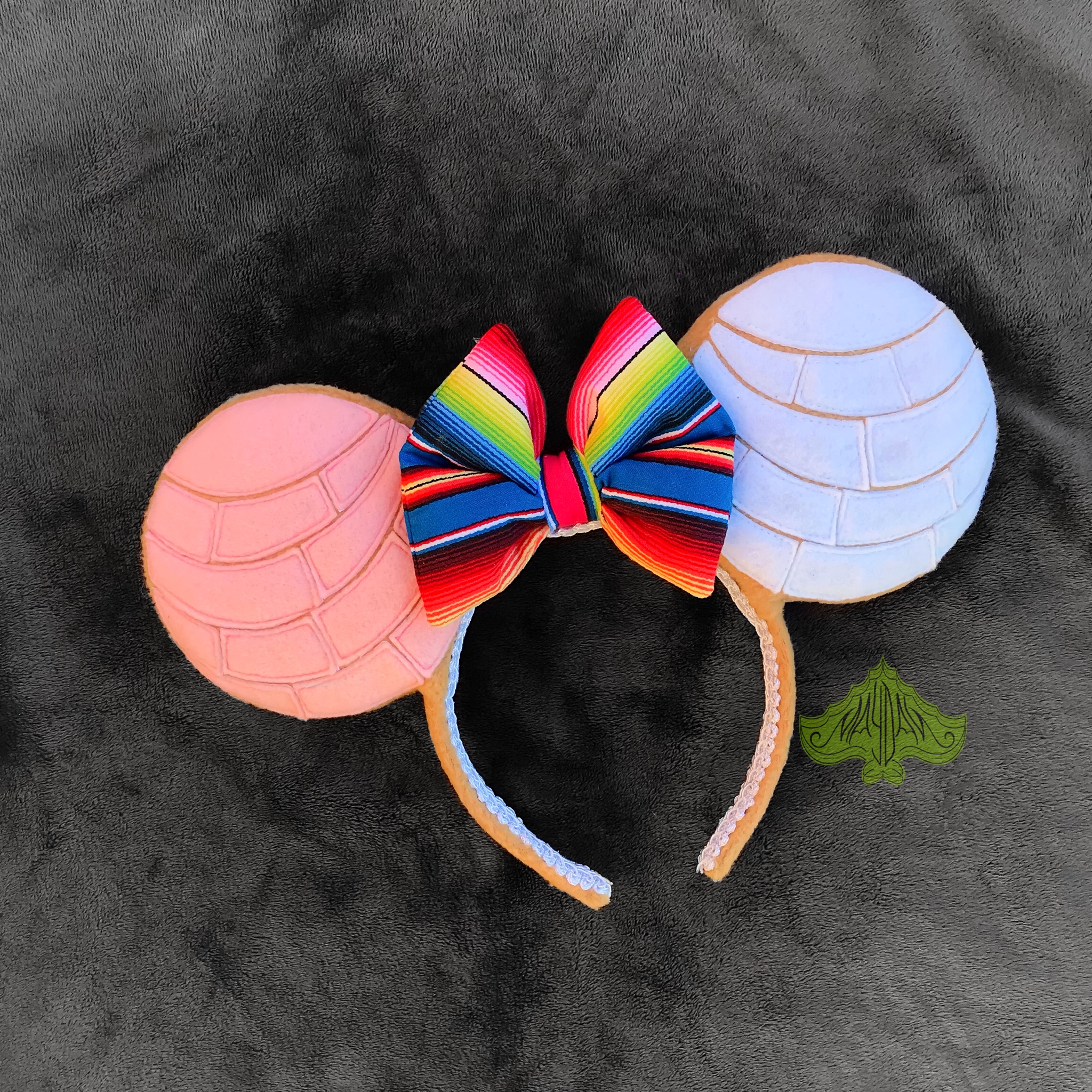 Mayday Couture original Pan Dulce conchas, handmade using khaki fleece and pink & white felt . Center of the headband comes with a sarape cotton pattern bow.