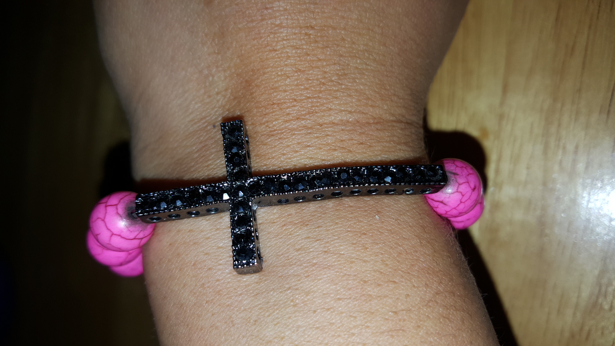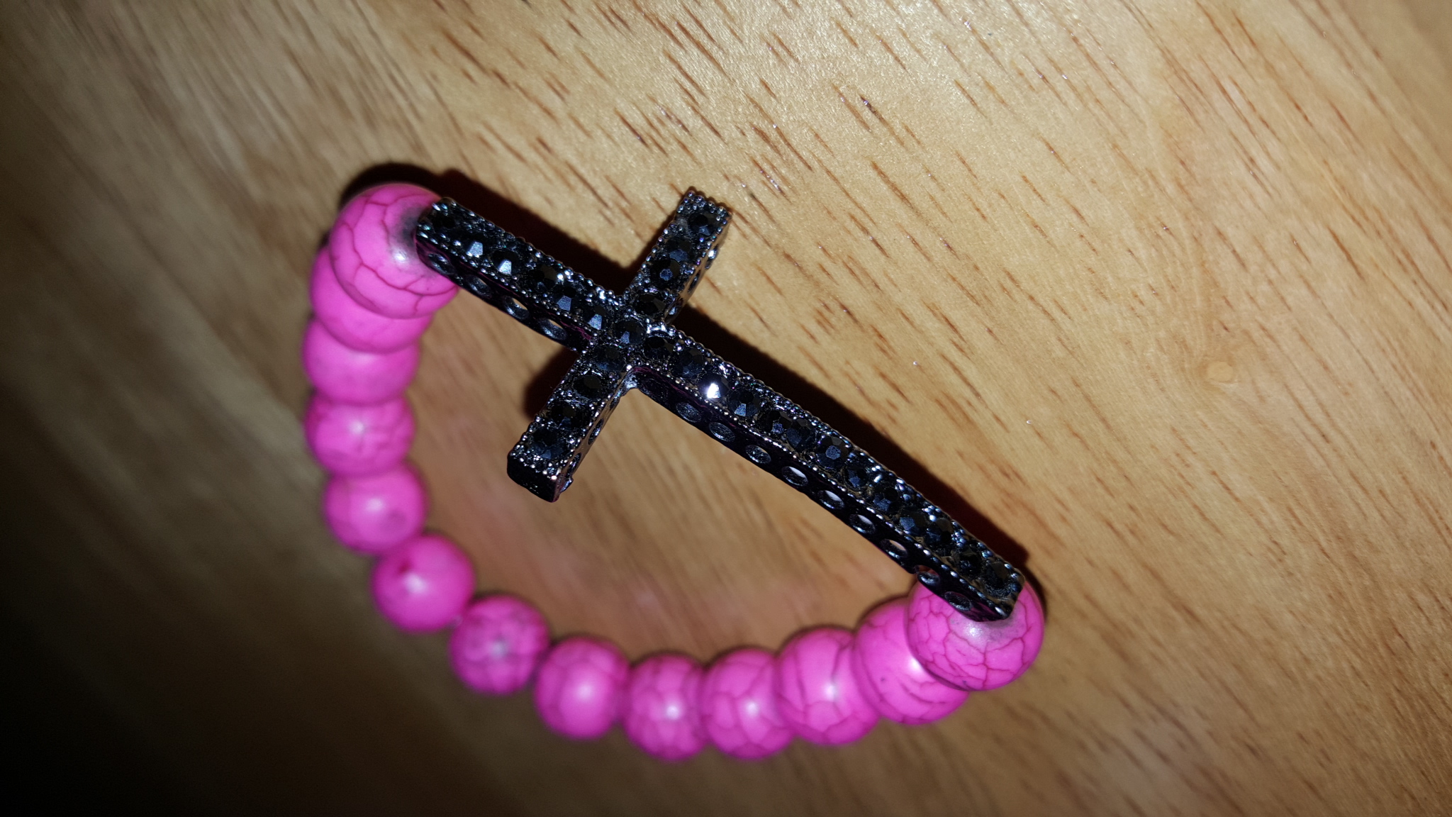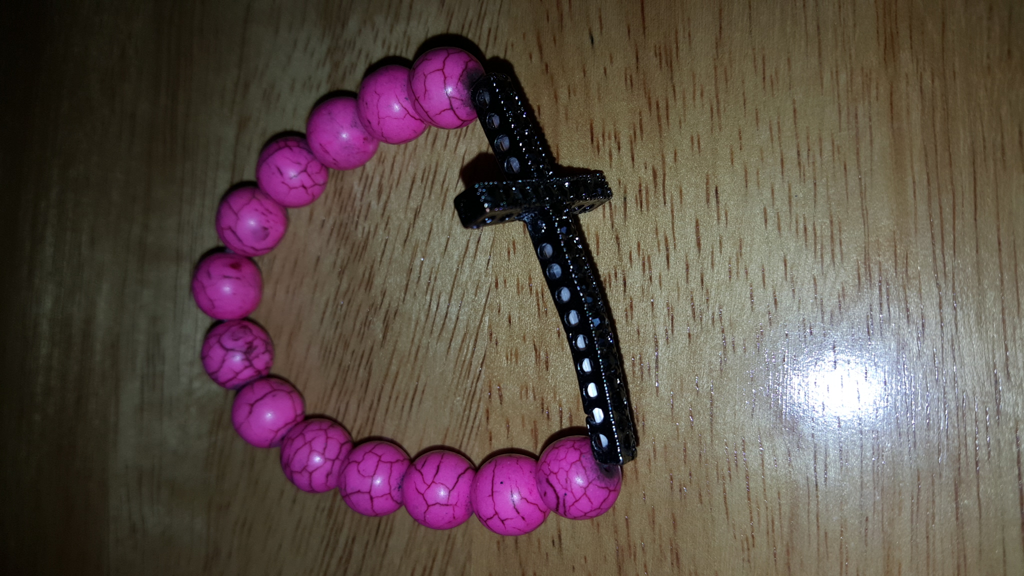 Pink Howlite Beaded Black Crystal Cross Bracelet Faith- Love- Peace Durable Standard Size Stretch Bracelet