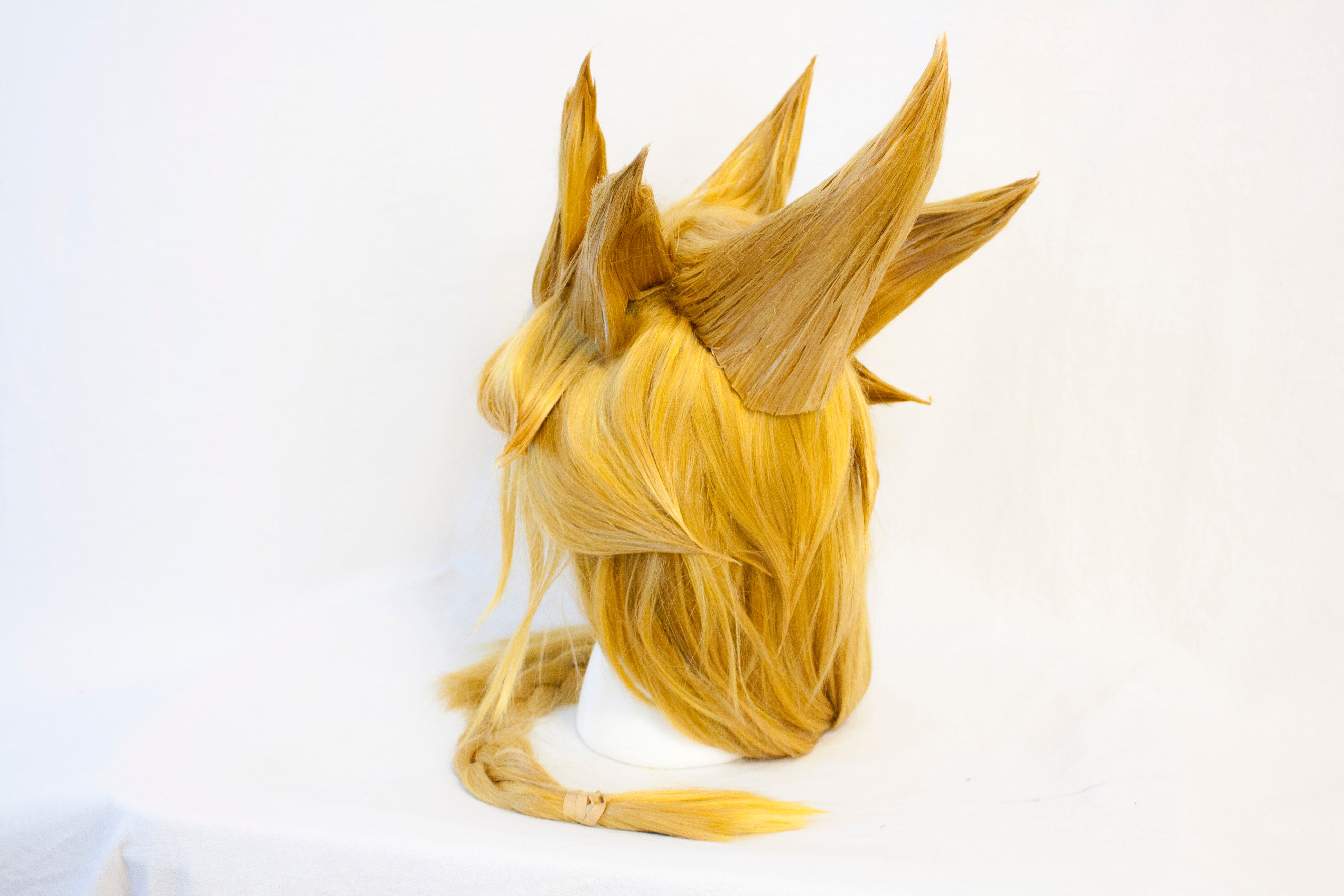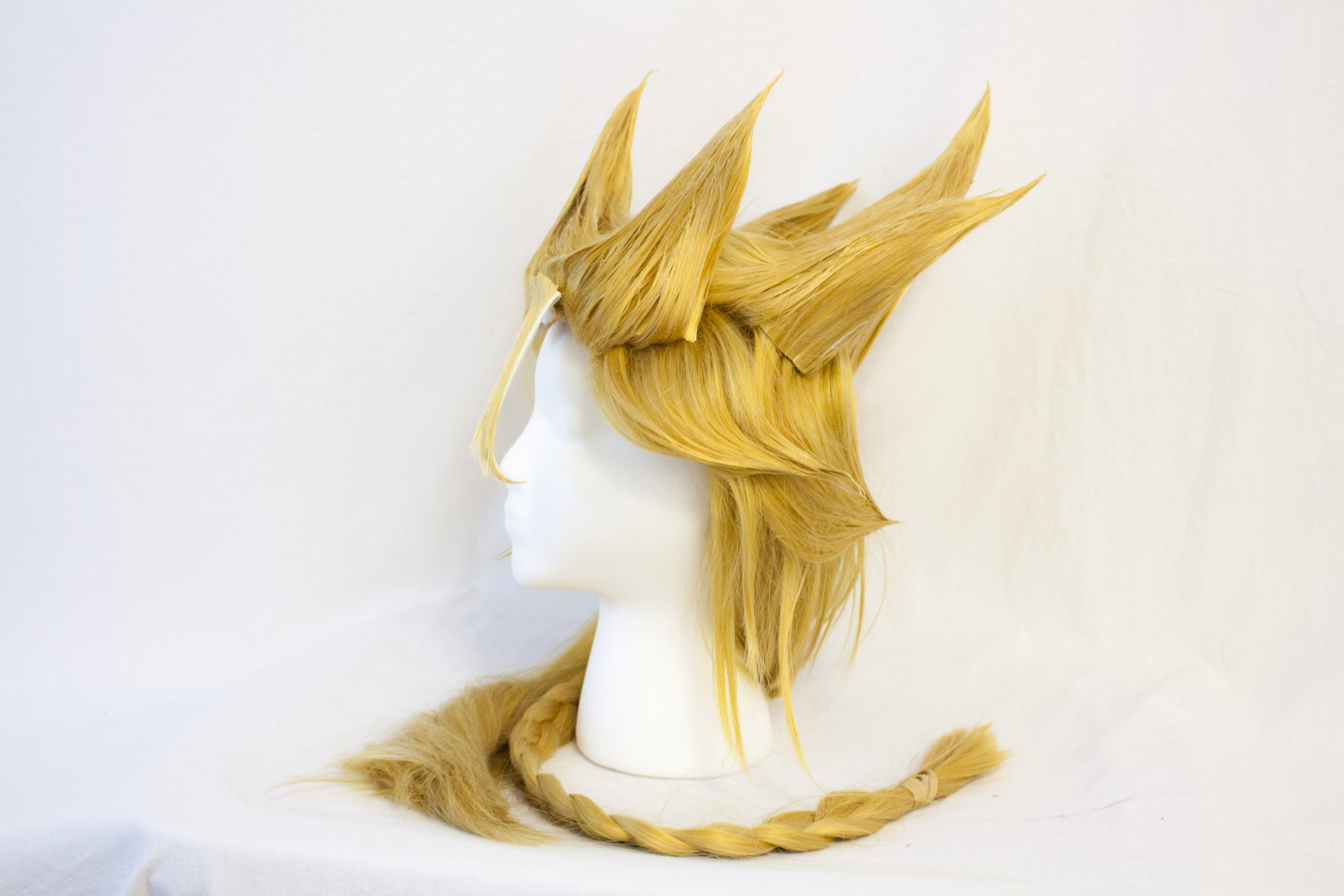 This wig was my valiant first attempt at intense spiking under a time constraint. As such, I had a lot to learn; this wig isn't perfect. There are some spots where the foam core of the spikes is visible. The wig was also intended as a genderbend design so there's a lot of extra hair to work with for the underlayers if someone would like to build this wig into a full fledged (non genderbend) wig.