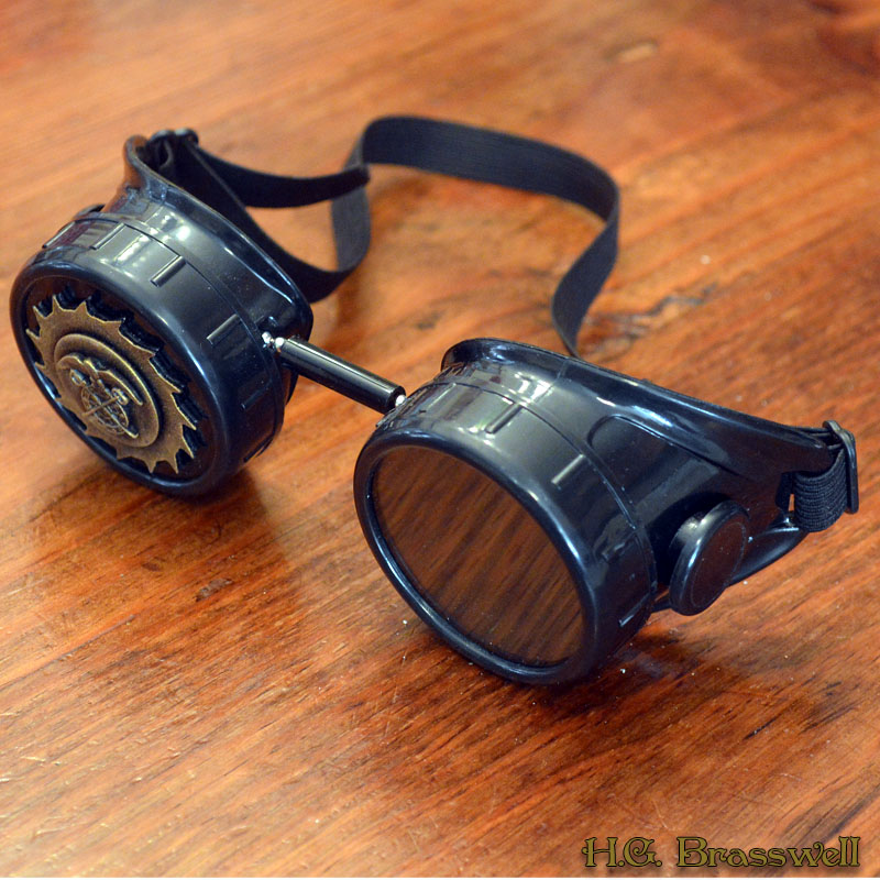 Welcome! Steampunk Goggles from H.G. Brasswell. Our goggles are perfect for any airship captain, mad scientist or starship trooper. If you need eye protection, we have you covered. Black Steampunk Welders Goggles with Gold Eyepiece Interchangeable 50mm Anti-Fog, Shatterproof UV-400 Polycarbonate Lenses Black Adjustable Head Strap
