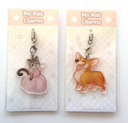 This double-sided acrylic corgi charm measures approximately 1.5" The front is clear acrylic and the back is protected by a candy-gloss coating. Each charm includes a 2" white strap with lobster clasp. These charms are great for decorating phone cases, purses, key rings, or wherever else you please! *Currently out of stock! More should be available in April.* Also available as: Signed Print Greeting Card Sticker Necklace
