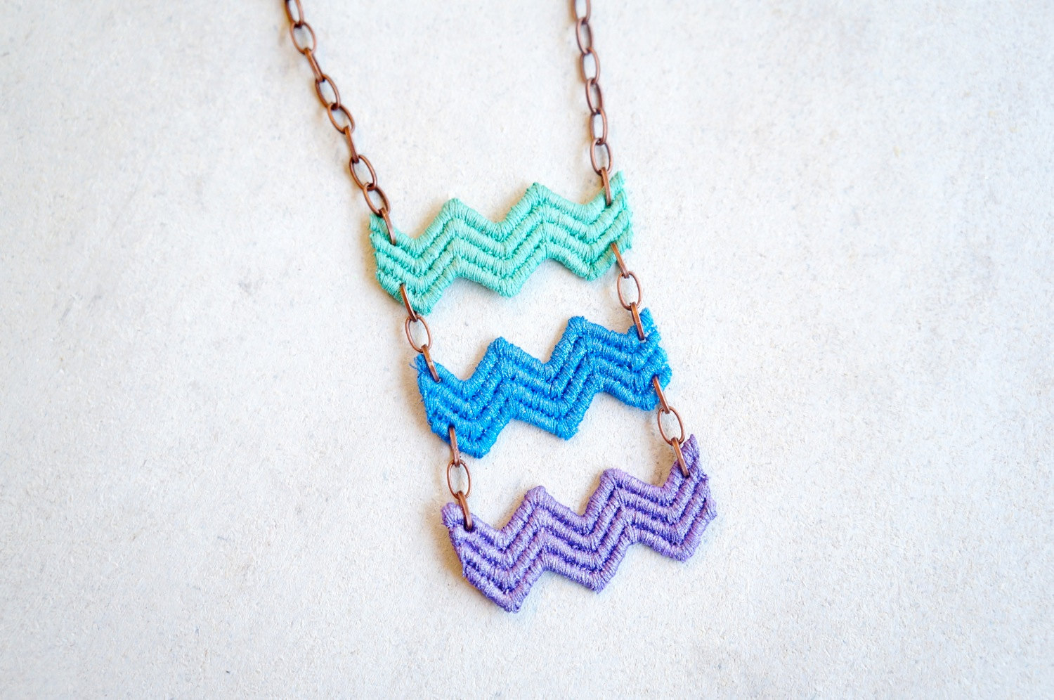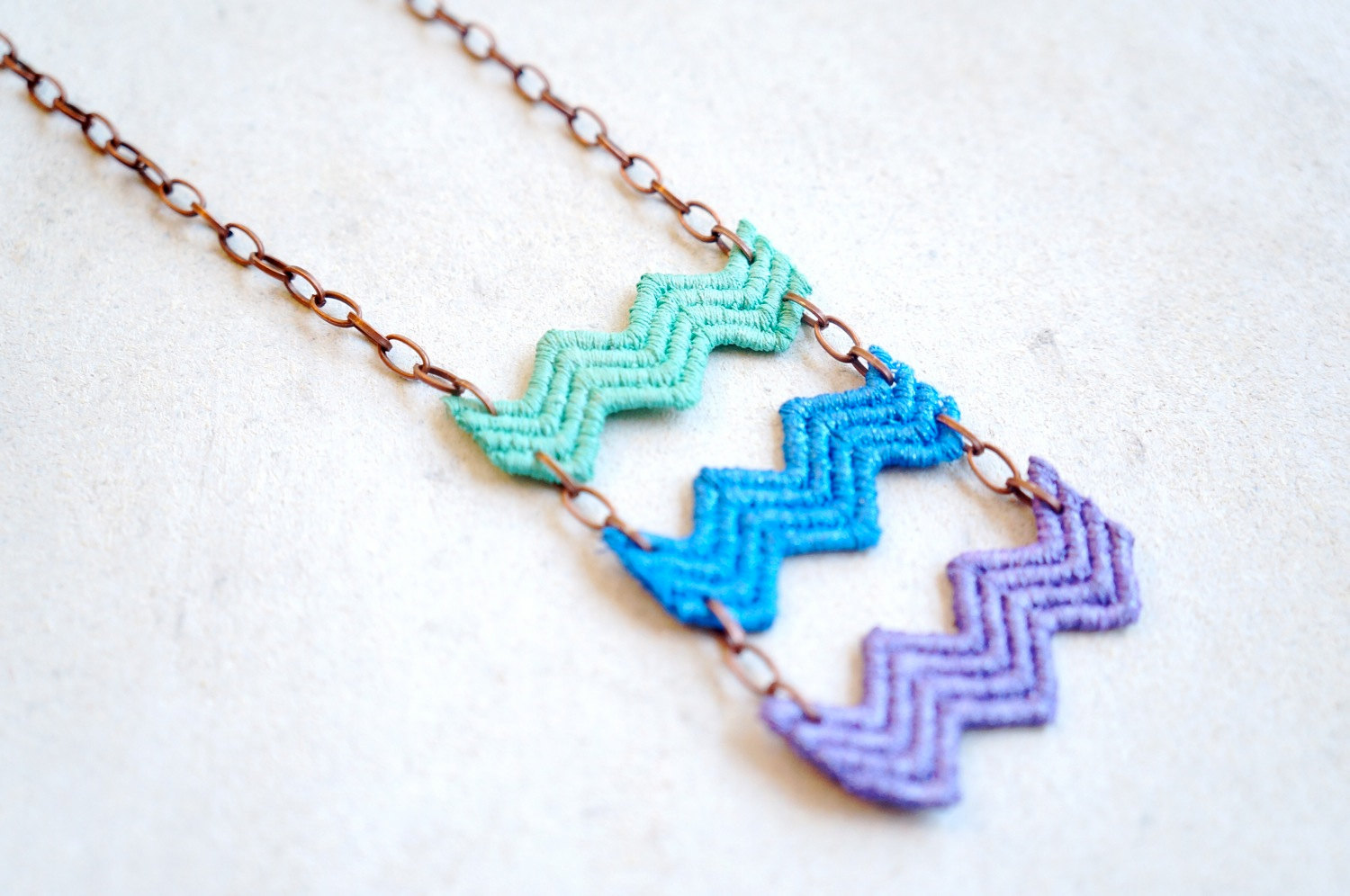 Hand painted lace by Lindsay of White Bear Each piece is personally designed to create a one of a kind, unique gift for yourself or someone special! It's like receiving a little piece of wearable art. This item can be made into any color combination of your choice. This beautiful hand painted chevron inspired lace necklace is hanging from antiqued copper chain and is in the colors of mint green, cobalt blue and purple. Lace is about 4 inches long by 2 inches wide. A true statement piece. Remember, don't like the colors? I can make it in whatever you want!
