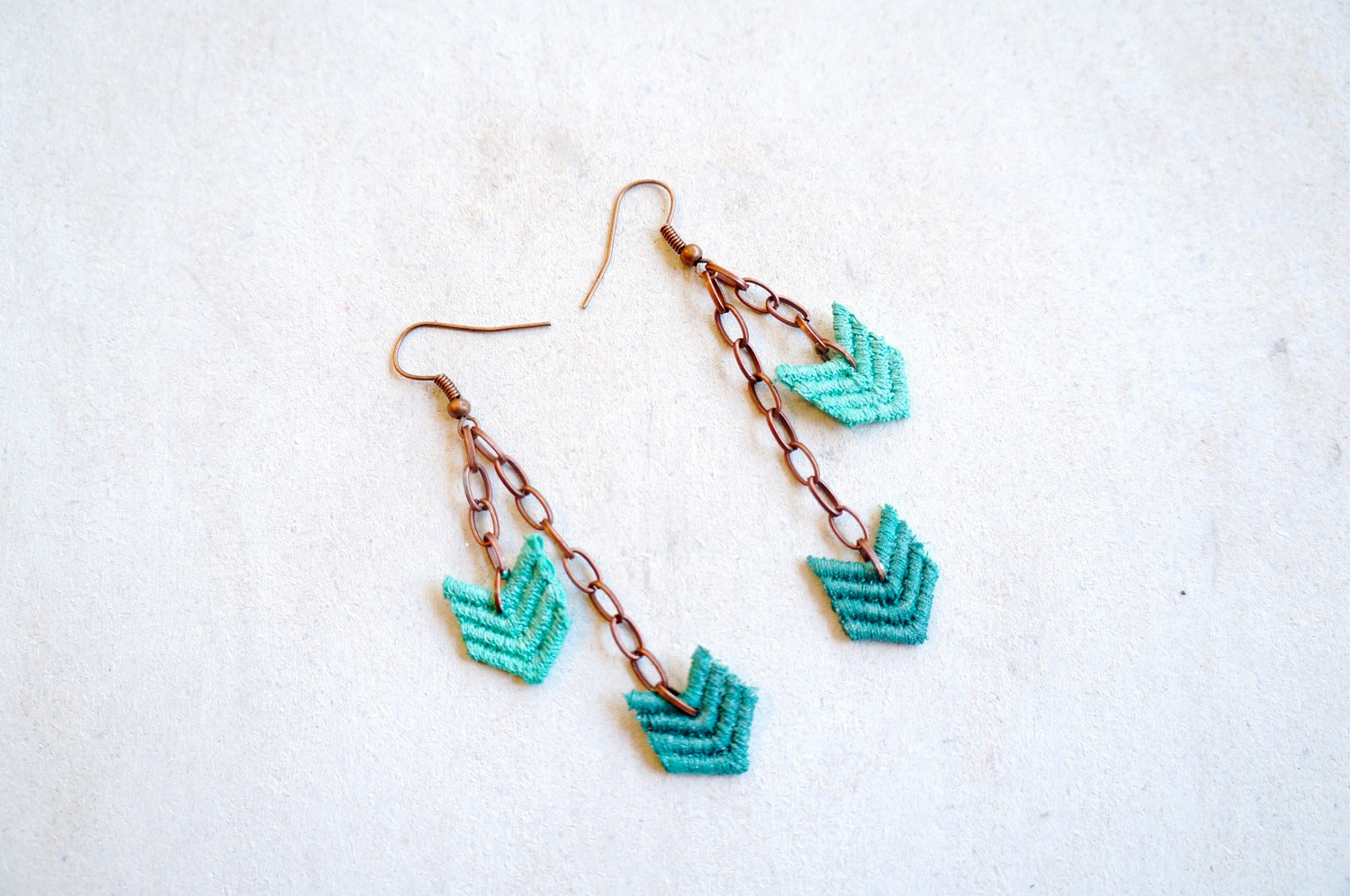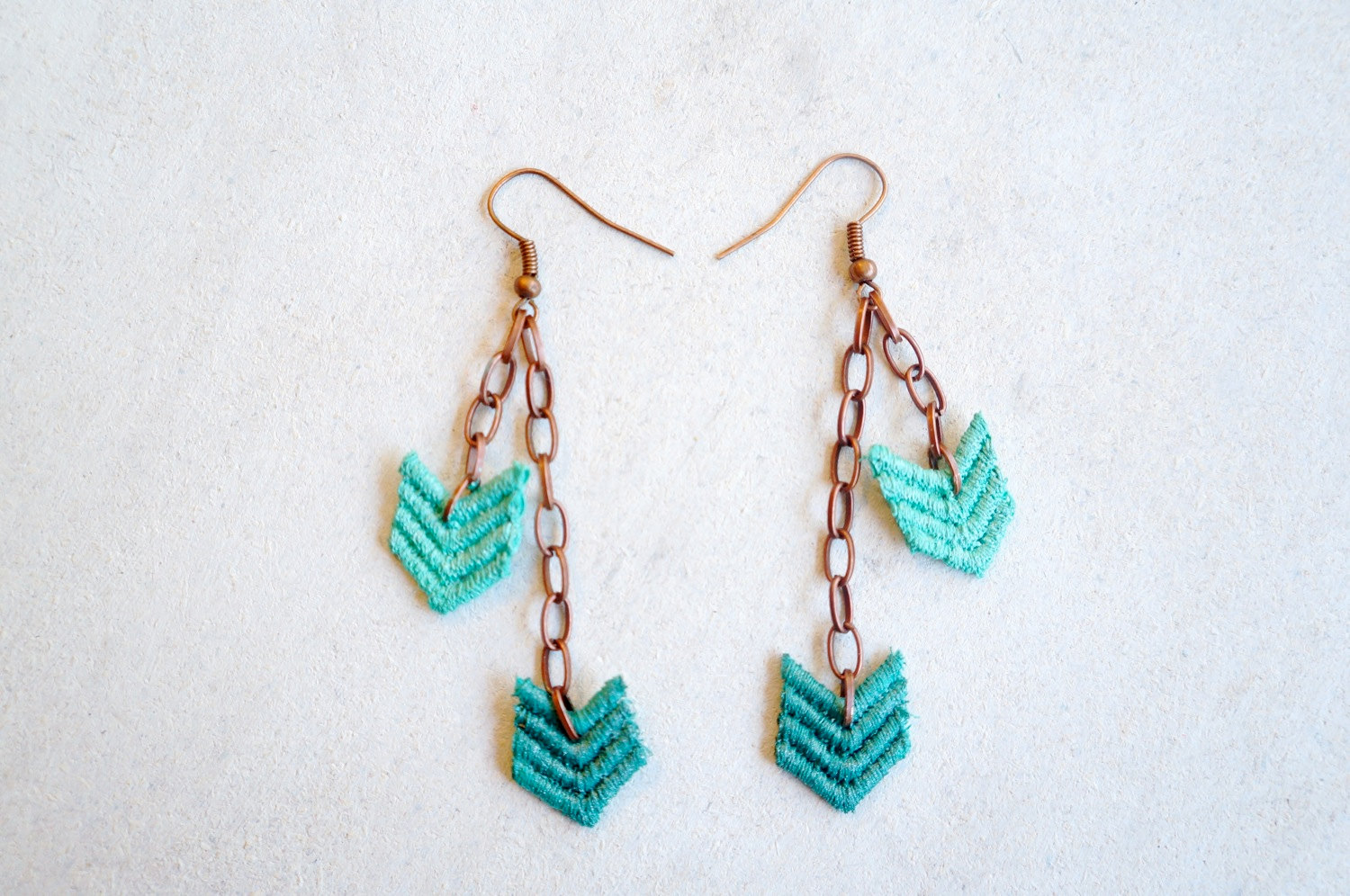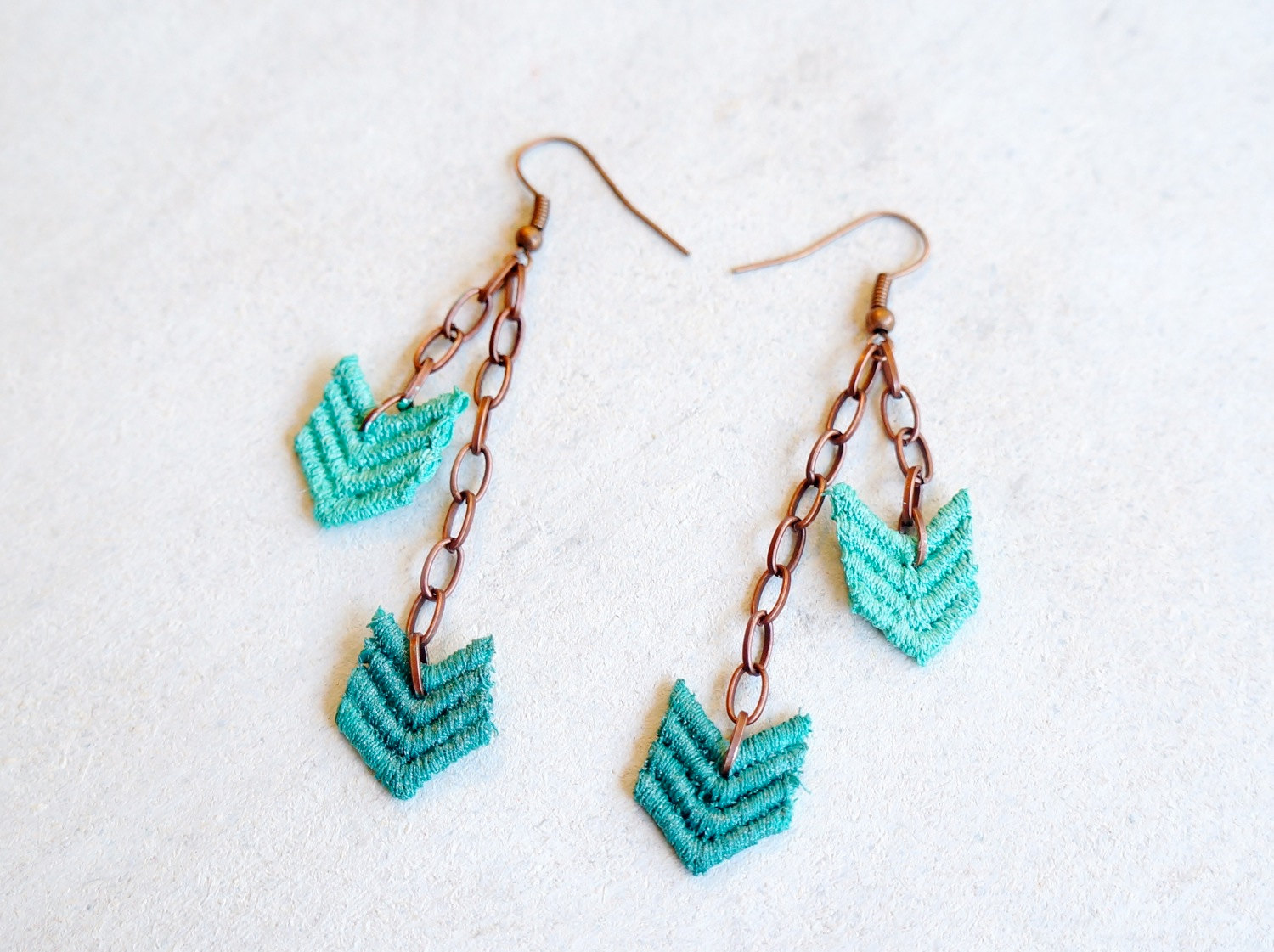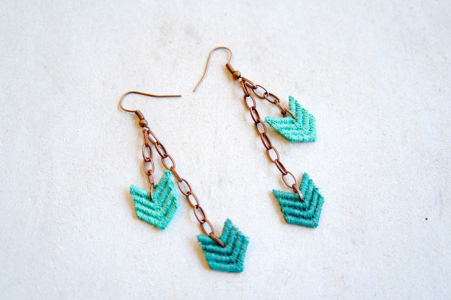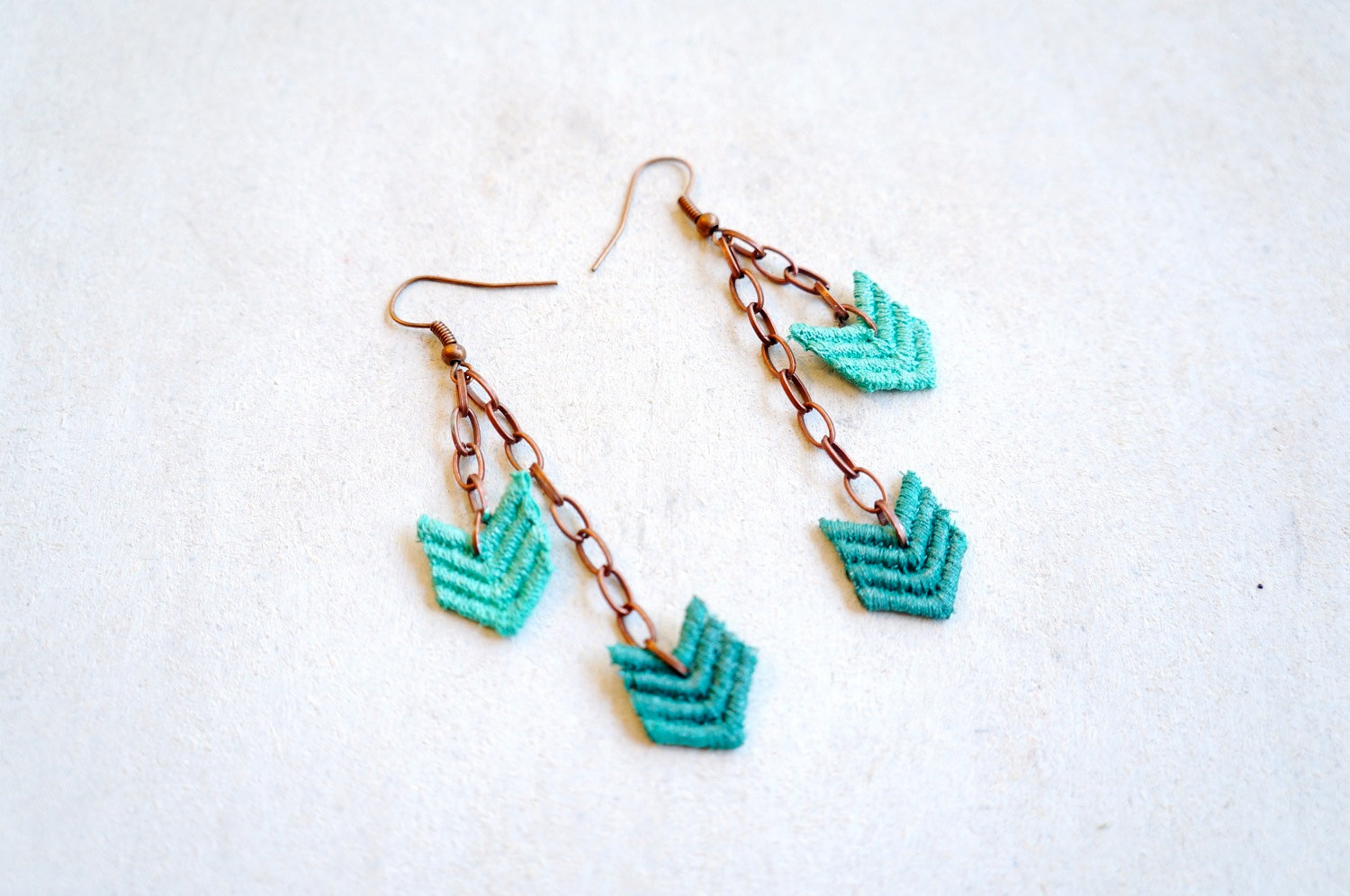 Hand painted lace by Lindsay of White Bear Each piece is personally designed to create a one of a kind, unique gift for yourself or someone special! It's like receiving a little piece of wearable art. This item can be made into any color combination of your choice. These lace chevron earrings are hand painted in gorgeous bright teal green and deep teal green. Attached to antiqued copper chain and ear wires, they hand 3 inches and are very light weight. Remember, don't like the colors? Let me know and I can make them in whatever you desire!