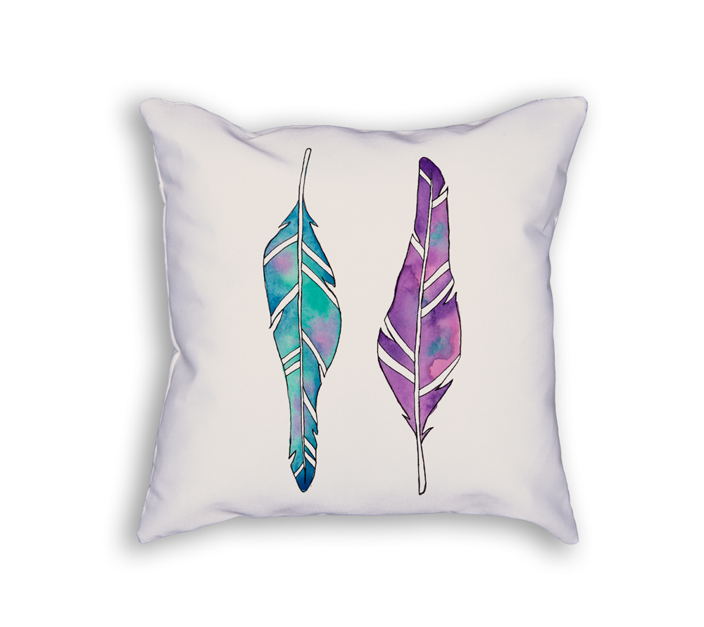 Whimsical watercolor feathers on a pillow, what more could a girl want. •18x18 inches •80% polyester / 20% cotton fleece •Soft, durable and suitable for fine print •Double sided print •Concealed zipper •Machine washable •Pillow insert included (handwash only) •Resilient polyester filling retains shape