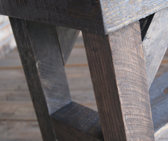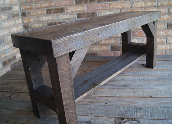 Free Shipping! Fully reclaimed bench. Made to order out of Solid wood. Reclaimed barn wood and some pallets lumber make this a one of a kind. Stained with ebony colored finish. Has poly over entire piece to make it hold its brilliance for years to come. Your new bench will be slightly different than what is pictured, that one has sold. Measures 48" wide x 18" tall x 11.5" Deep. Very stable Salvaged from a steel transport pallet, and a barn. This piece has a great look. We notched in the front legs giving it a wider stance. While leaving the back legs recessed. This allows the bench to be right up against a wall with none of your stuff falling behind it. Free Door to door shipping Thanks For looking: FurnitureFarm 877-295-7077