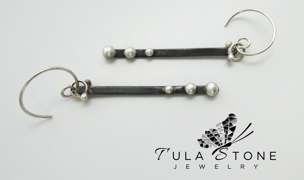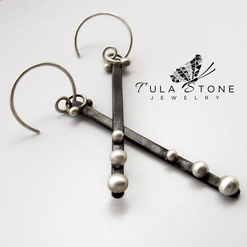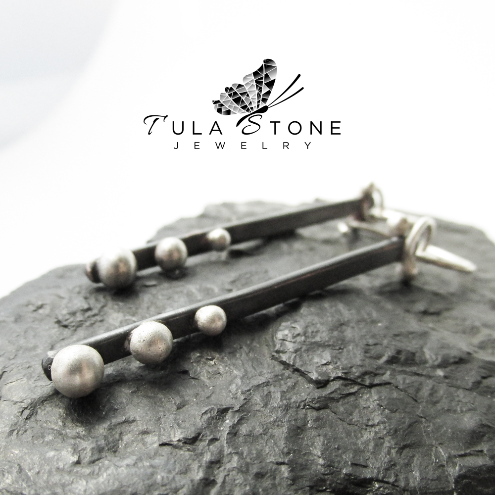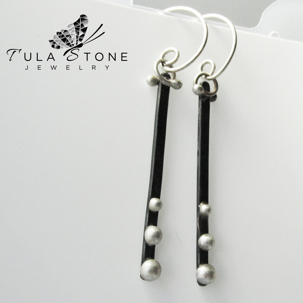 Thick-gauge blackened copper is accented with graduated spheres of Argentium Silver in these unique and understated goth-style earrings. They can be dressed up or down. Over time, the blackening will wear in places, creating a rustic look where the copper starts to show. These earrings ship free within the United States!