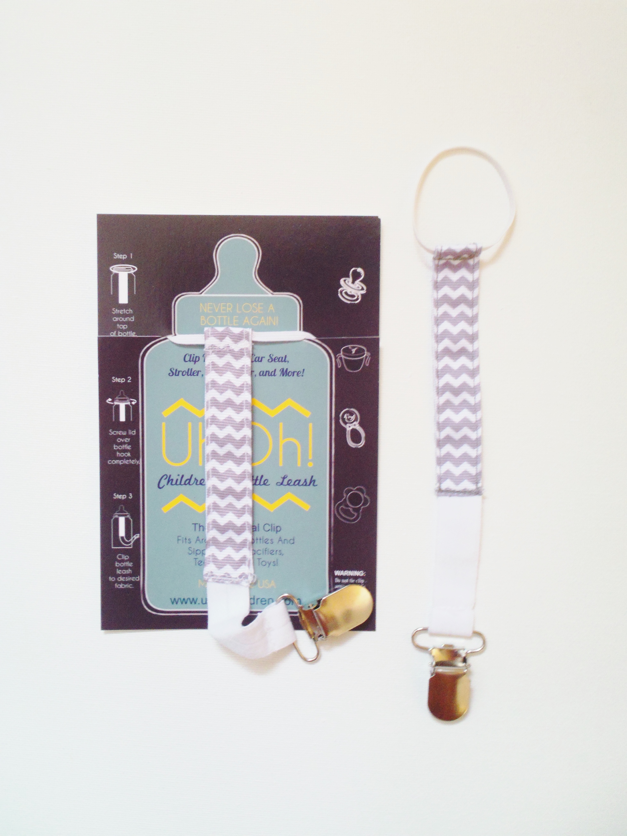 The UhOh! Universal Clip is the solution to many of your "UHOH!" problems. Keep your child's bottle or sippy cup, pacifier, toy, snack cup, and more from falling to the ground or getting lost in your car by hooking your UhOh! Universal Clip around top of the un-lidded bottle. turn the bottles lid over the hook completely and then attach your clip to the desired fabric to keep your child's bottle within reach and off the ground. The hook is expandable to fit any size bottle or sippy cup!