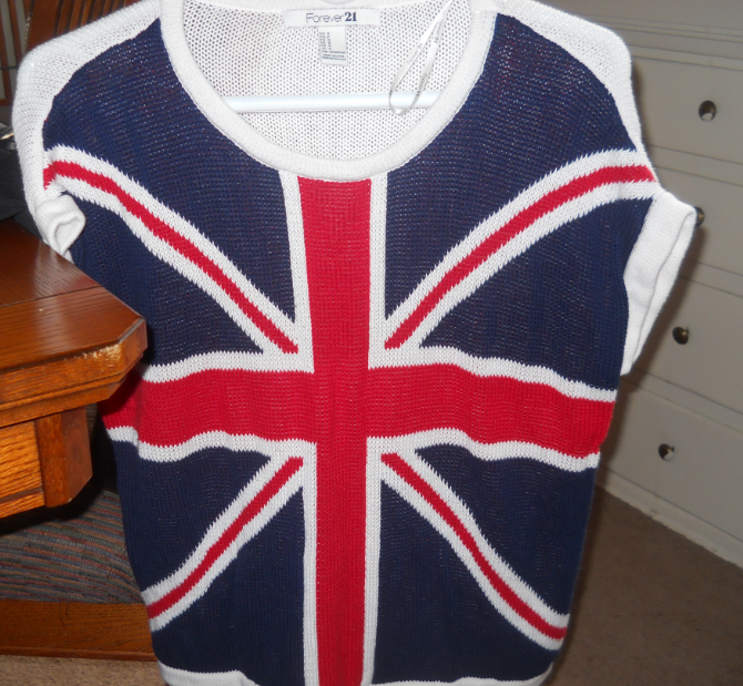 Its a short sleeve top with the Union Jack on it. It is a sweater kind of material. Size small. From Forever 21. Its cute but Im just not a fan of wearing flag shirts anymore.