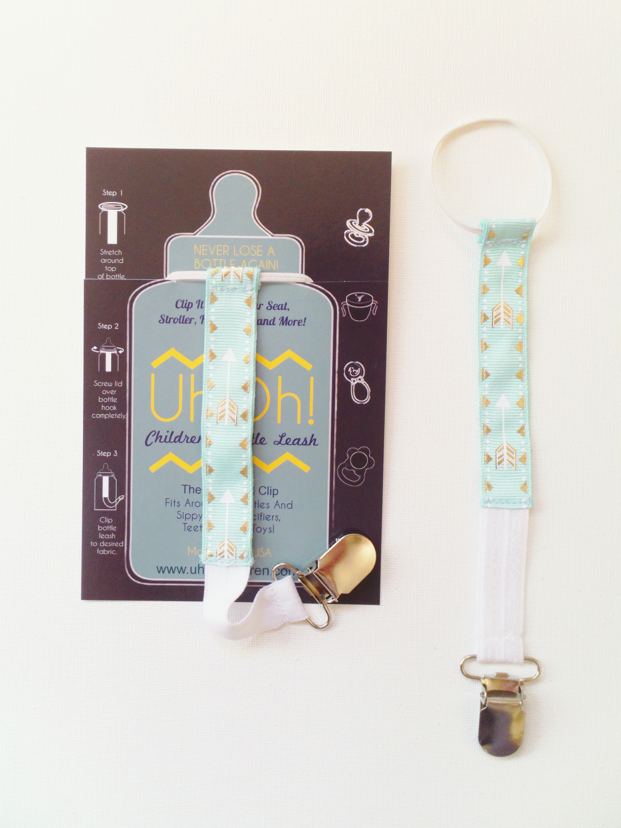Have you ever driven your child around in a car or a stroller and had them throw their bottle, pacifier, toy, snack cup, or any item within reach and yell "UHOH!" as soon as it hits the floor? Or even in a restaurant? Not only can this be a 'germy' problem, but it can also be dangerous in the car should you feel compelled to retrieve the lost item to satisfy your child. If you've experienced this many times and are desperate for a solution, I'm here to help! The UhOh! Universal Clip is the solution to many of your "UHOH!" problems. Keep your child's bottle or sippy cup, pacifier, toy, snack cup, and more from falling to the ground or getting lost in your car by hooking your UhOh! Universal Clip around top of the un-lidded bottle. turn the bottles lid over the hook completely and then attach your clip to the desired fabric to keep your child's bottle within reach and off the ground. The hook is expandable to fit any size bottle or sippy cup! The hook can tie to all pacifiers, toys, snack cups, and more. This accessory is original and patent pending. It is not your average pacifier clip and it can be used for all uses mentioned above, no need for extra attachments or accessories. UhOh! bottle leashes are hand made in Lebanon, Pennsylvania by yours truly. Please contact me with an questions or special orders. For custom patterns, you can enter your request through my Custom Universal Clip item.