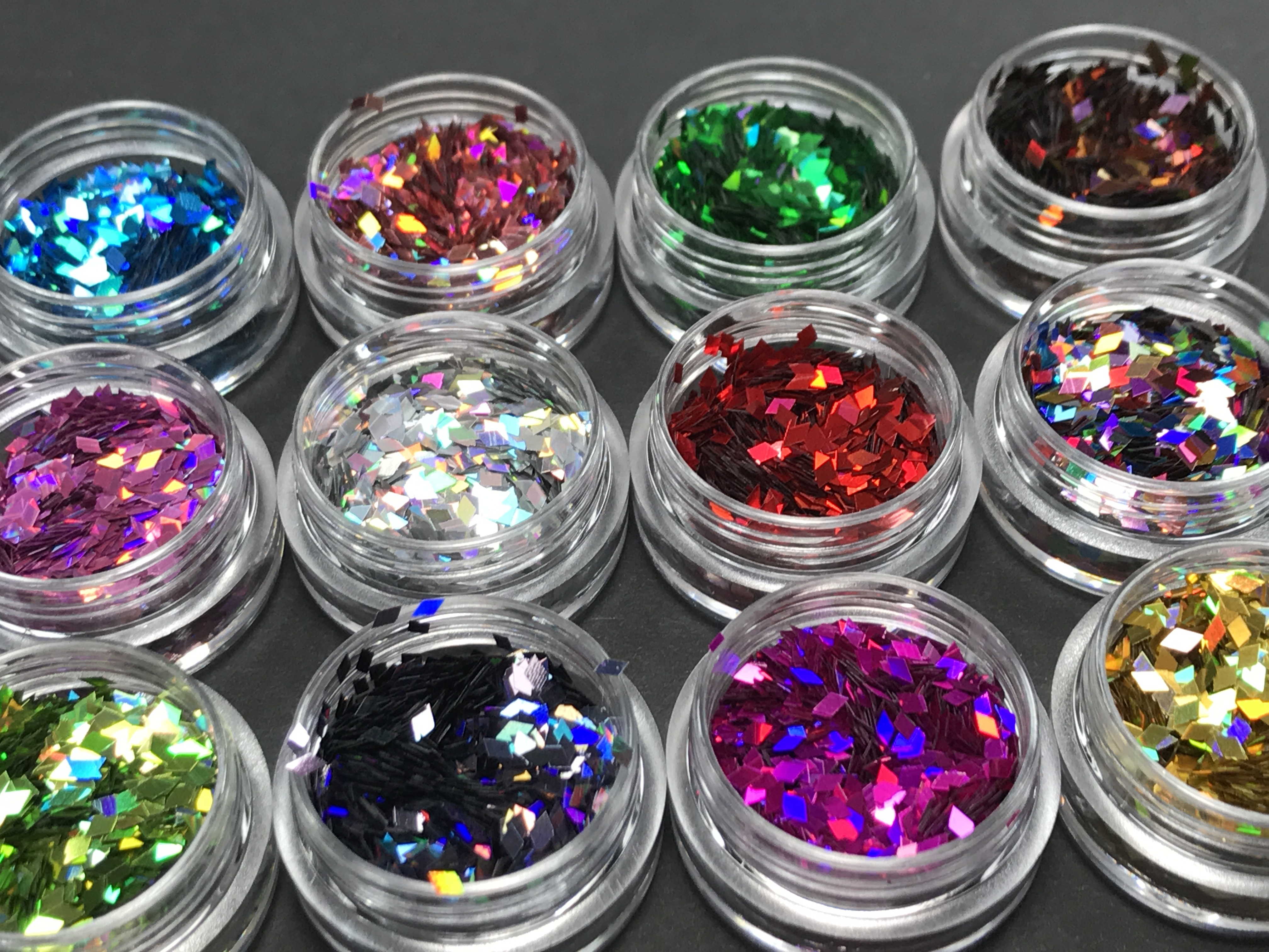 Item # AGF-85B Assorted holographic confetti in diamond shapes. Excellent for any kinds of decoration such as nail art, resin jewelry, mixed media, collage, card making, scrapbooking, glass... Choose from 12 different colors. Size: 1mm Clear 3 grams Jar