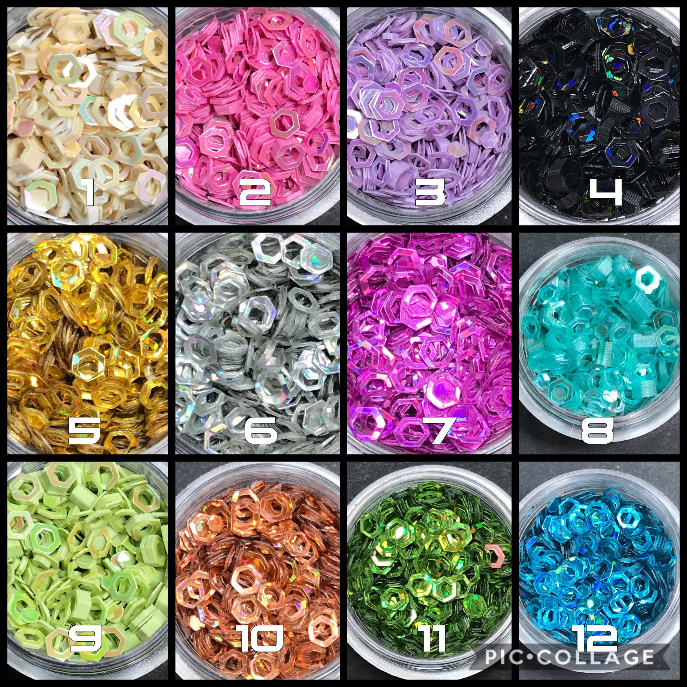 Item # AGS-08 These holographic hexagon are an excellent add- on to create the unique finished look. If you are looking for extra sparkle, holographic glitter is what you need. Perfect for 3D NAIL ART or flat application. Make your nails sparkling and add shiny color to your makeup! This glitter can be used with Acrylic, Gel, Nochip, Makeup, or Craft Projects. Size: 3mm Comes in a clear 3g Jar