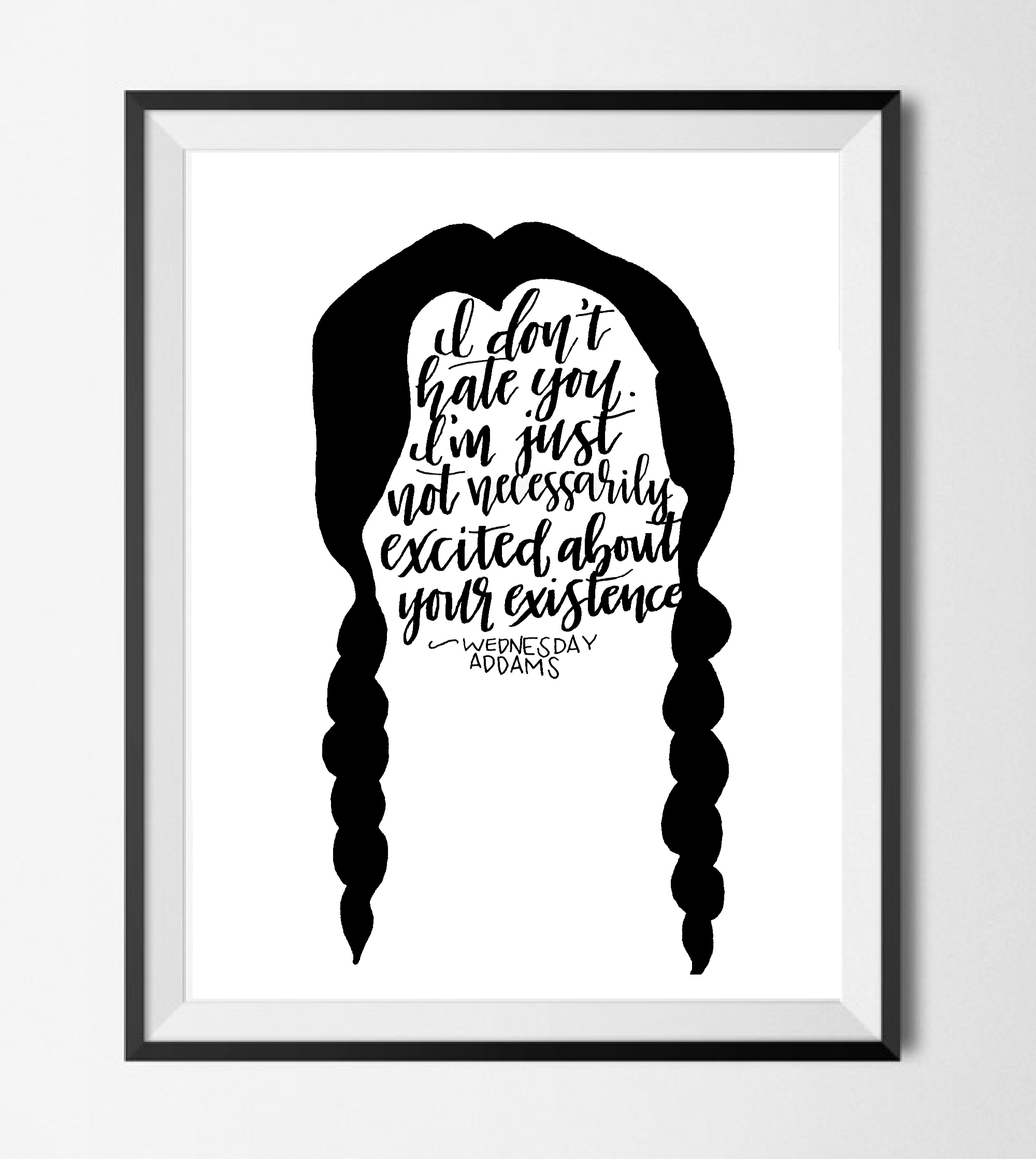 I don't hate you. I'm just not necessarily excited about your existence. -Wednesday Addams. This quote has made its way to the shop by popular demand and comes in 5x7 or 8x10 (please specify) and as always, each piece may vary slightly from the original.