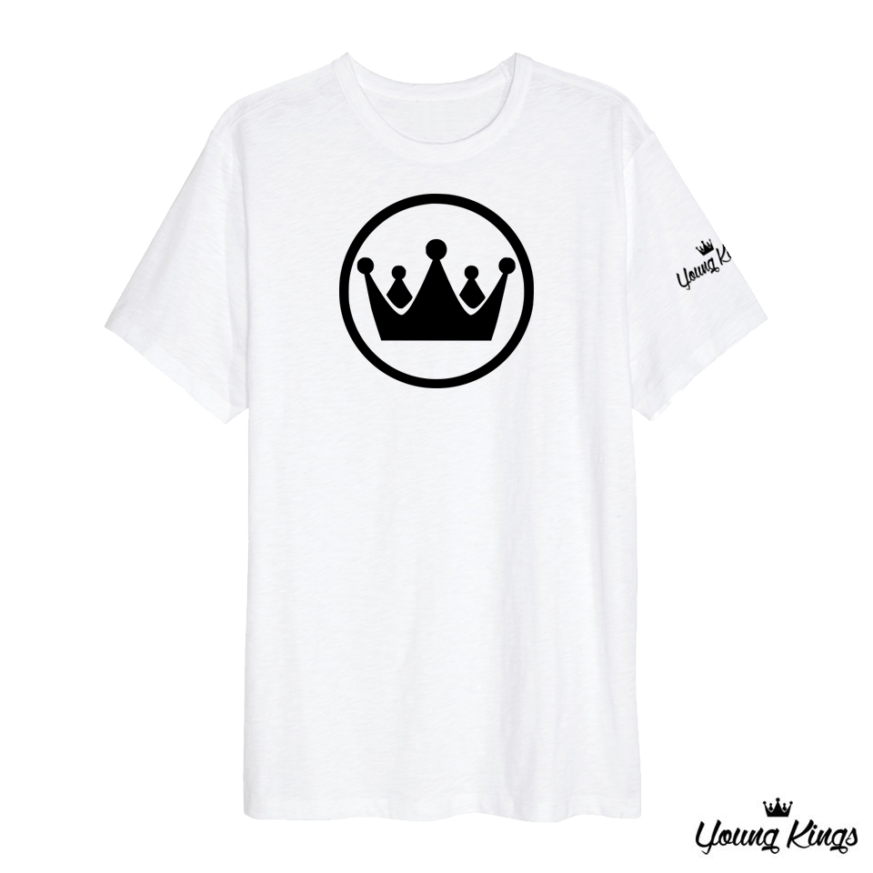 100% cotton black t-shirt with the Young Kings crown in a circle design hand printed in white ink.