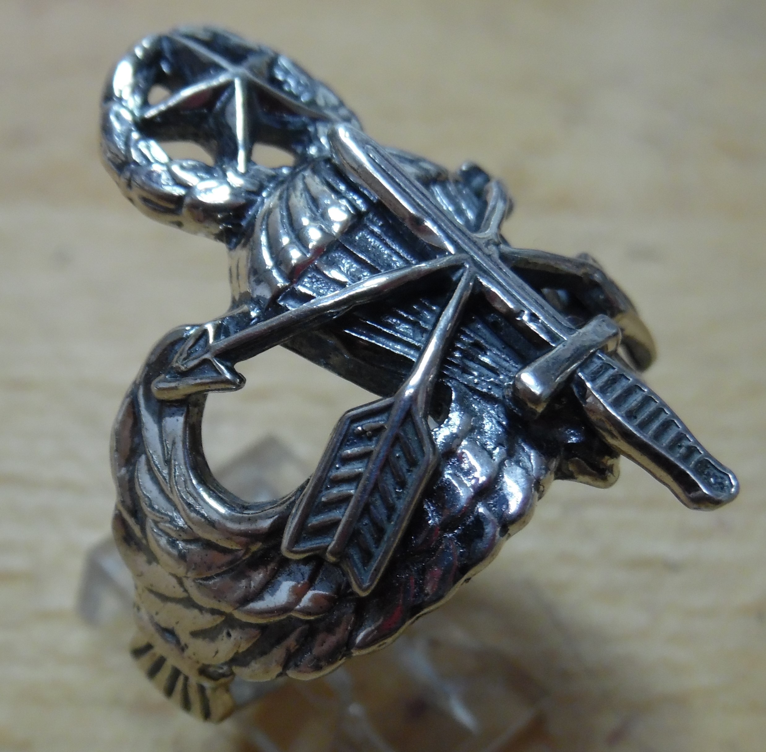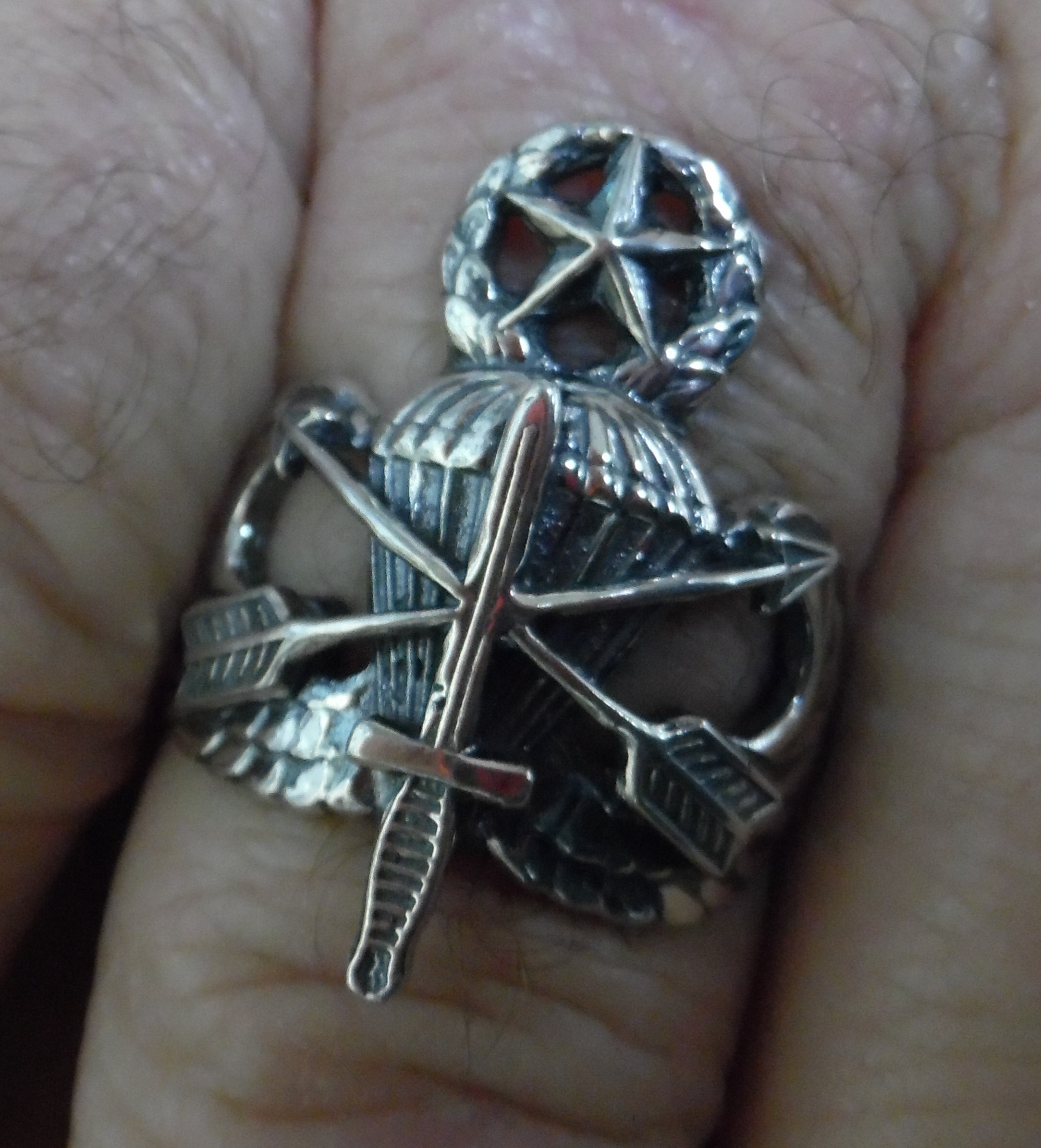 U S Army Special Forces Master Blaster Ring! Cast in solid sterling silver in my studio in Shreveport, La. It has the Special Forces Dagger and Arrows added to it. This Ring is not meant to be an official version of the wings. It was however actually submitted and rejected as an official version for Special Forces in 1983. This ring is an awesome way to show your pride for service! Available in sizes 9-16 including half sizes.