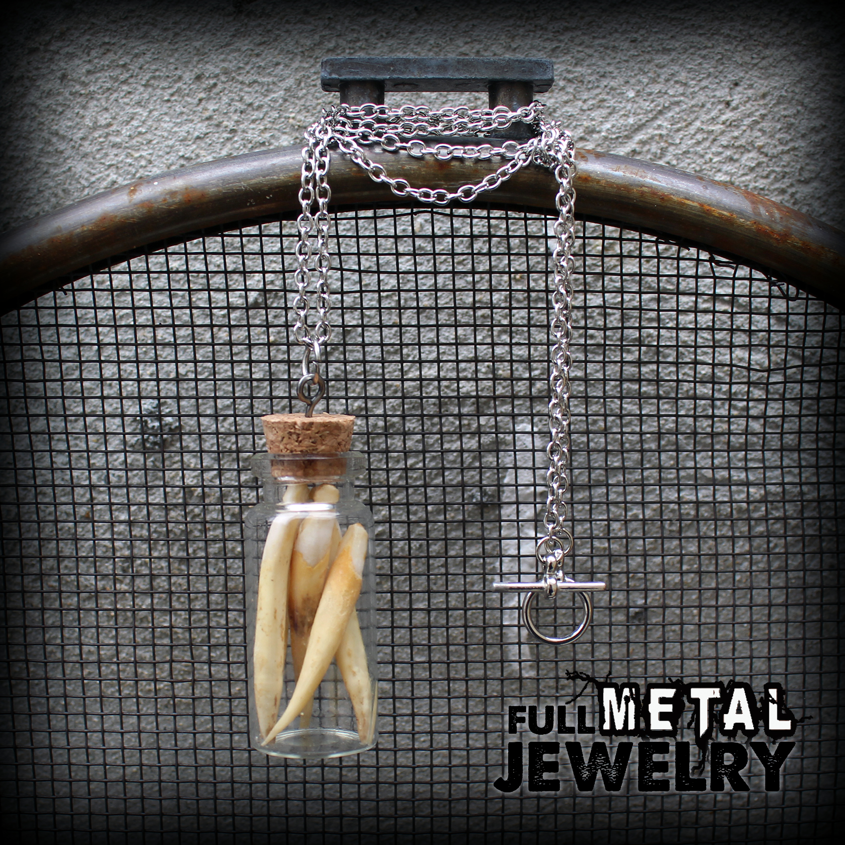 Multiple pig teeth in clear glass vial suspended from a silver chain. Chain Length: approximately 16" Vial Length: 0.25"