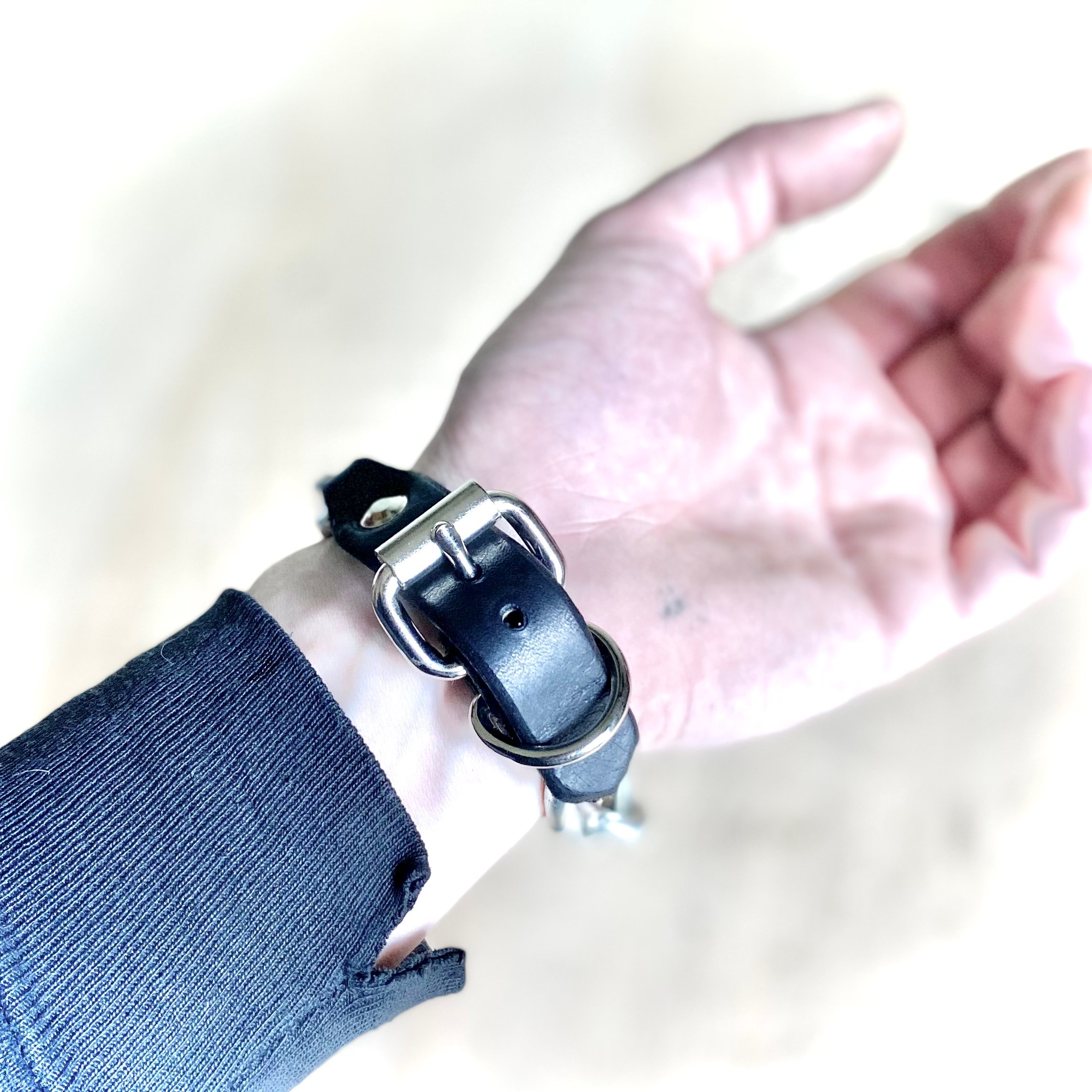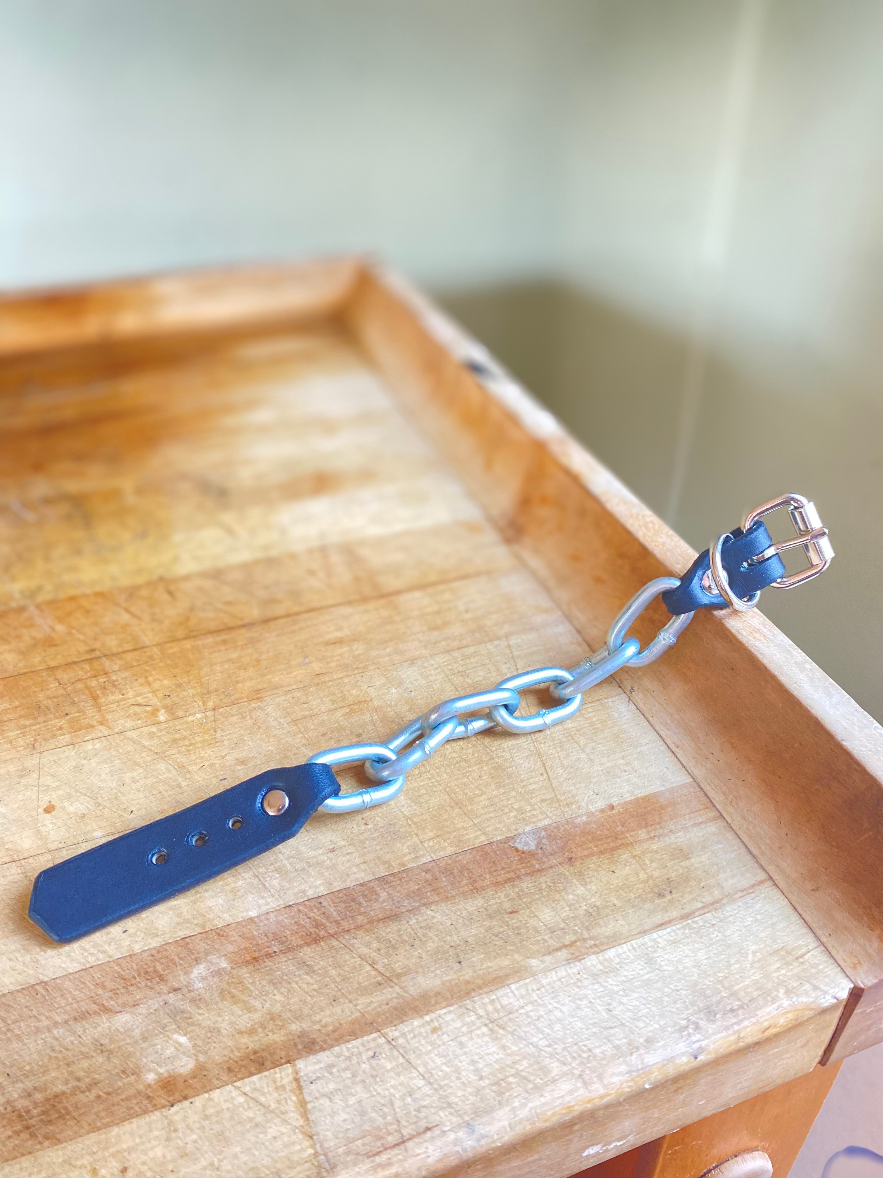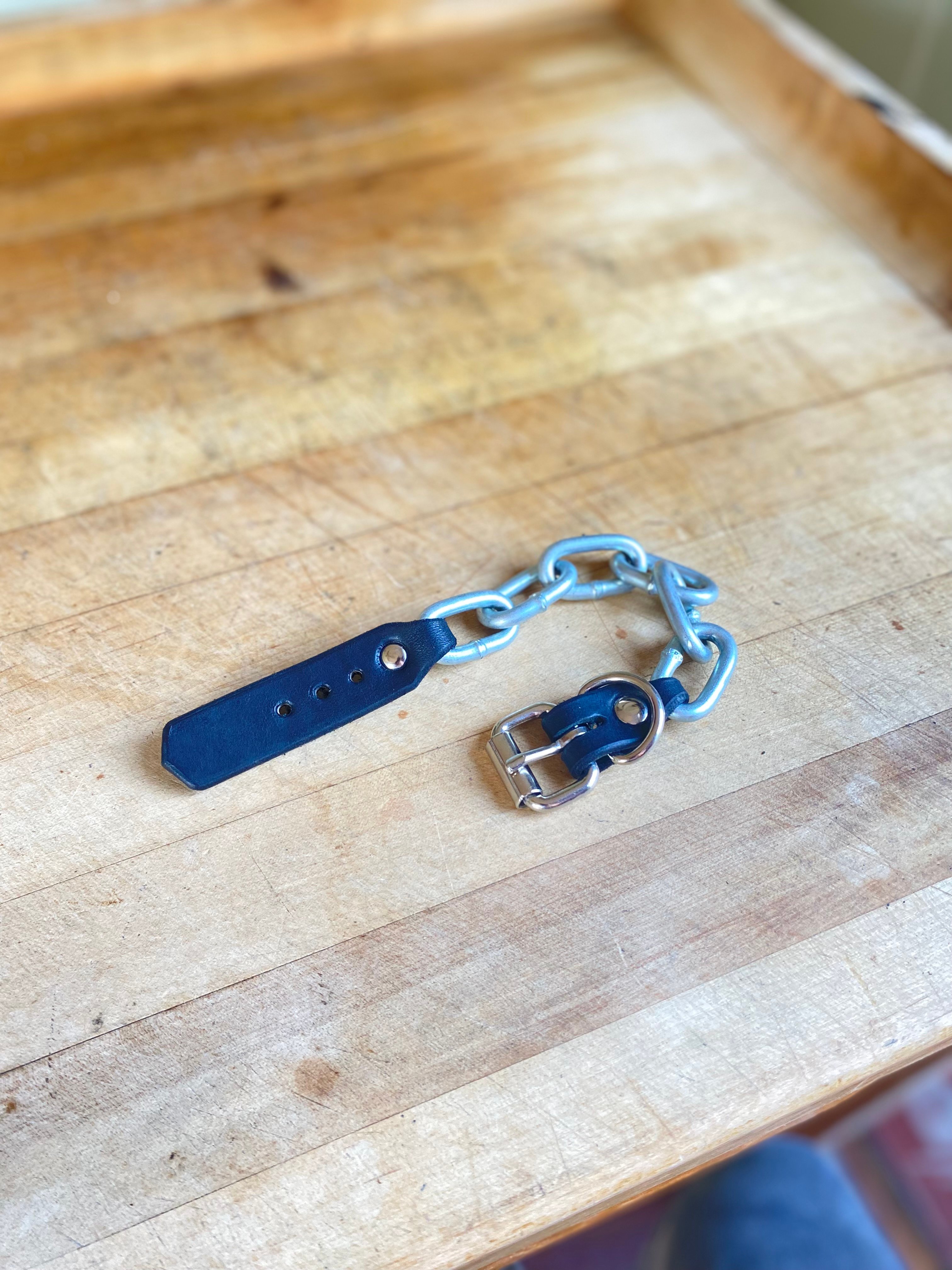 Heavy hardknock chain connected with riveted leather strap and nickel buckle with strap loop. Gear for the toughest street in town Please provide your wrist measurement with your order so we can fit it to you properly! Cheers!