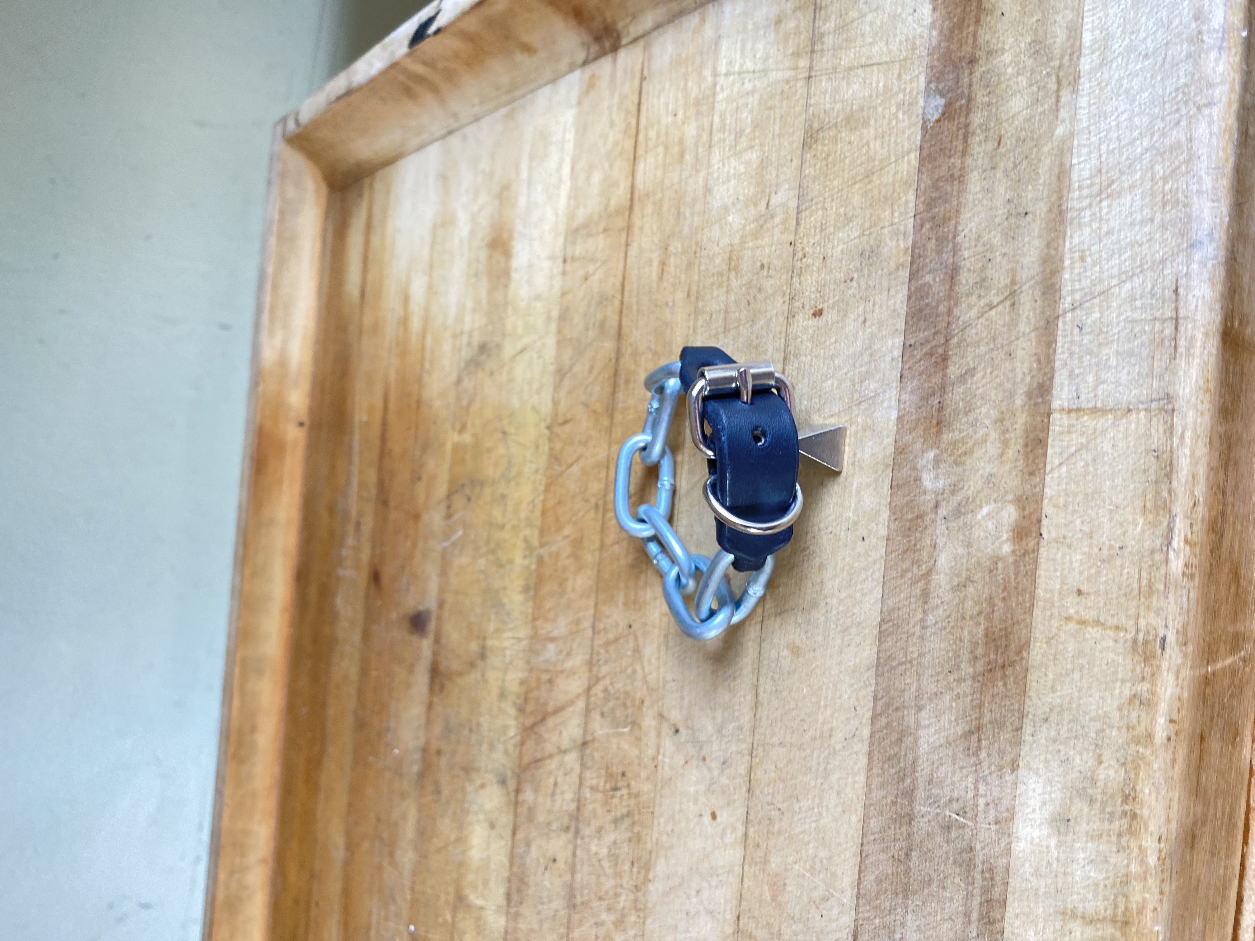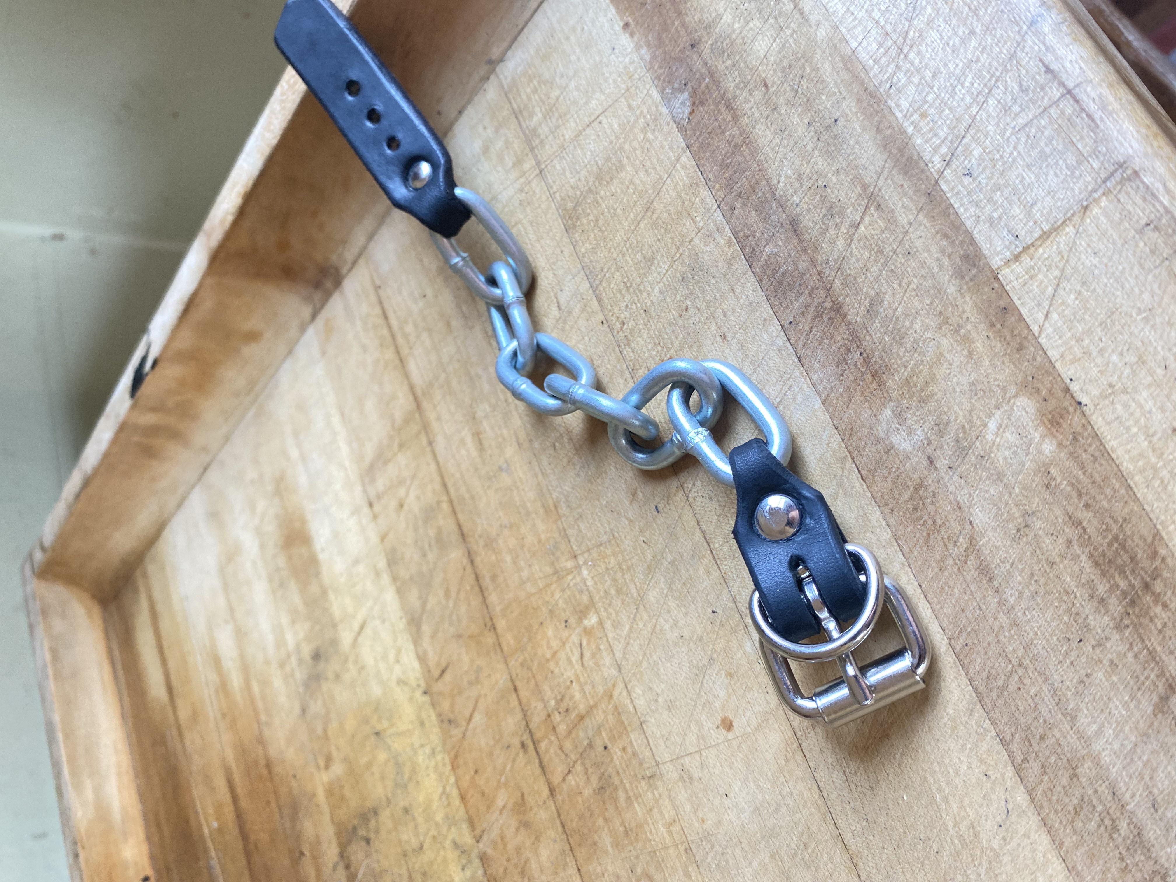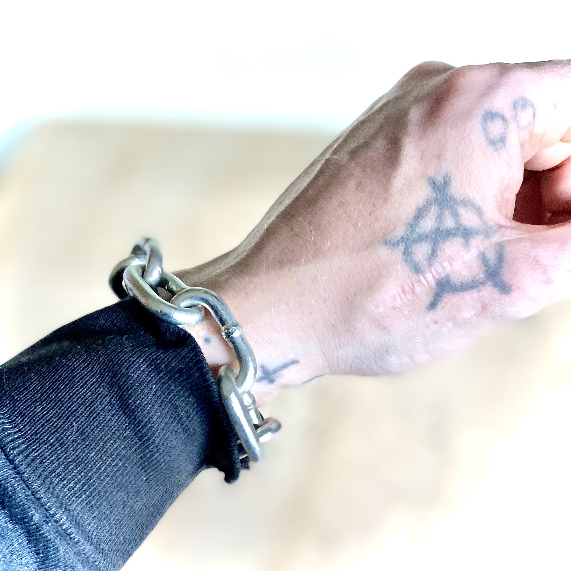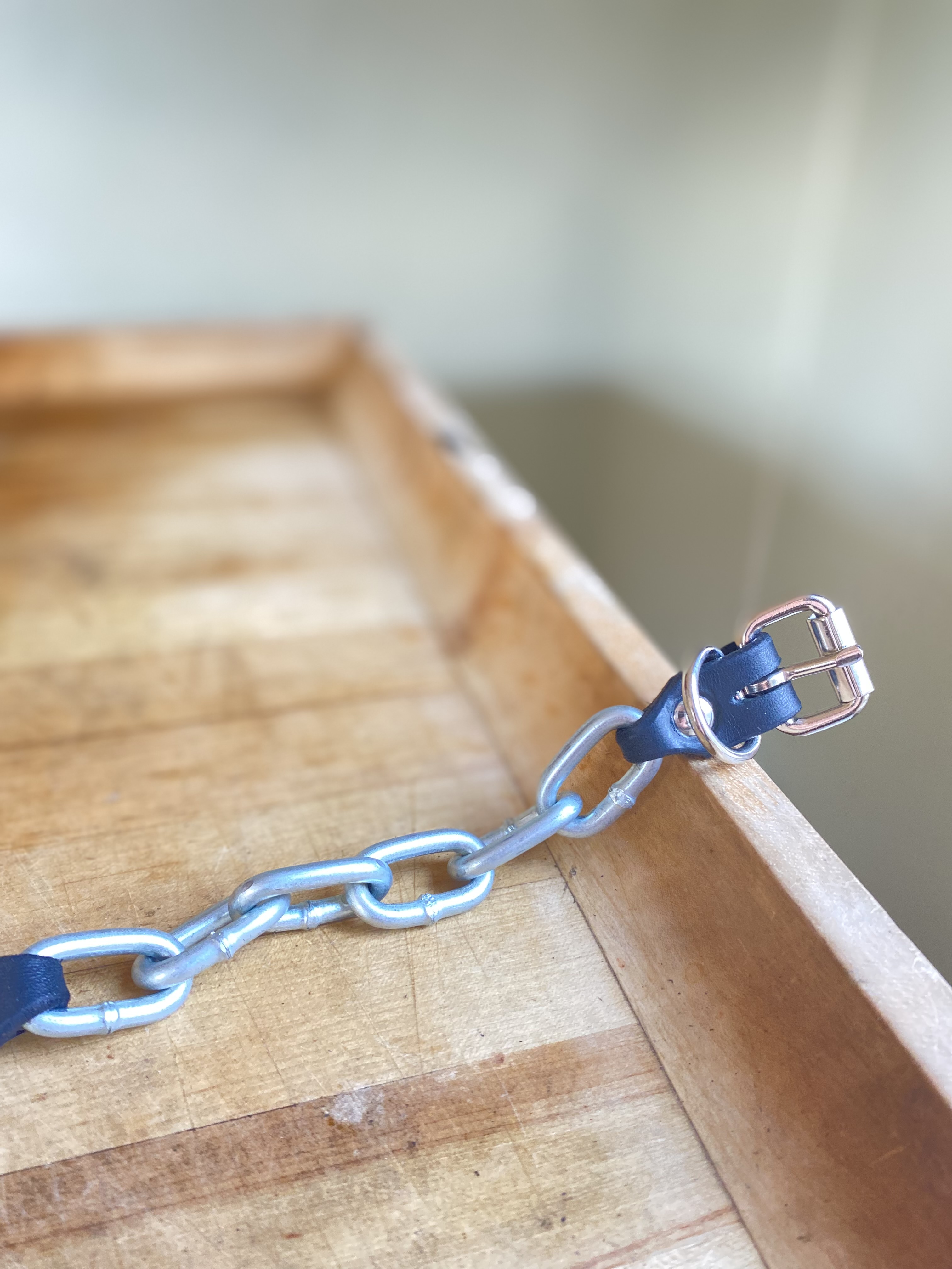 Heavy hardknock chain connected with riveted leather strap and nickel buckle with strap loop. Gear for the toughest street in town Please provide your wrist measurement with your order so we can fit it to you properly! Cheers!