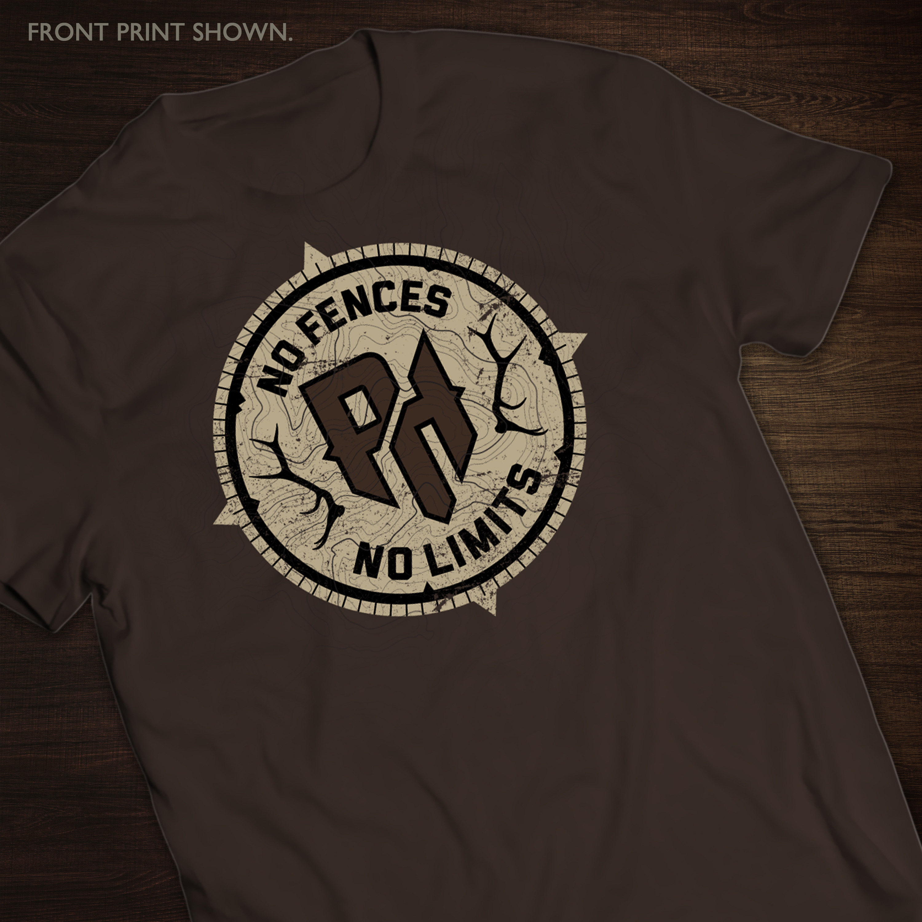 Pure Hunting "No Fences, No Limits" T-shirt. Compass, elk horns and too lines make an overall great looking design on the front of the shirt. Next Level brand shirt, 60% Cotton 40% Poly. Great shirt, comfortable and soft.