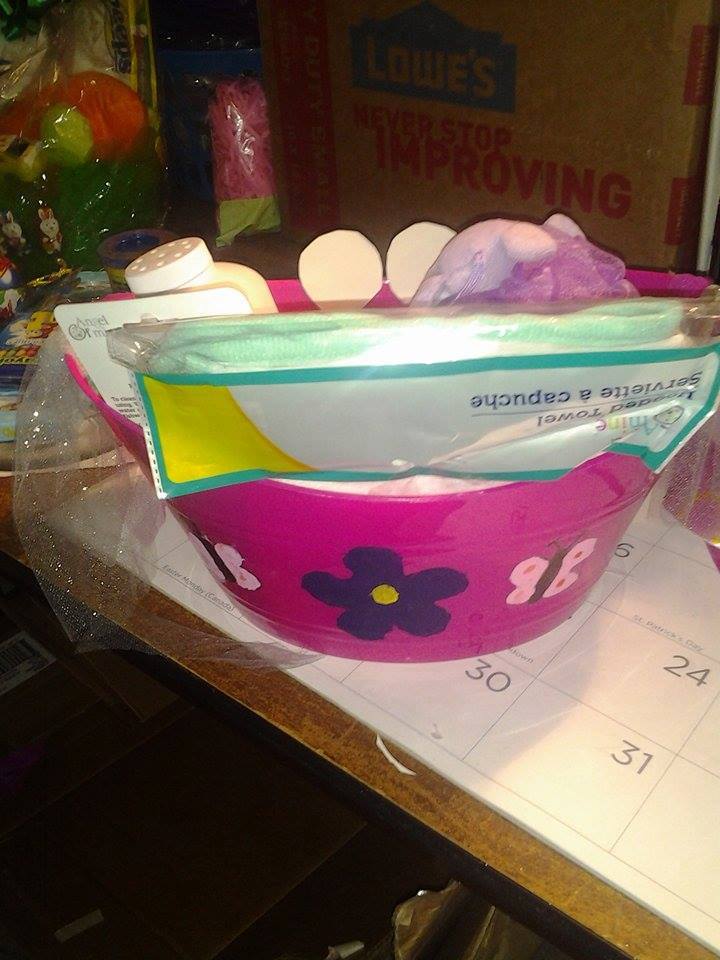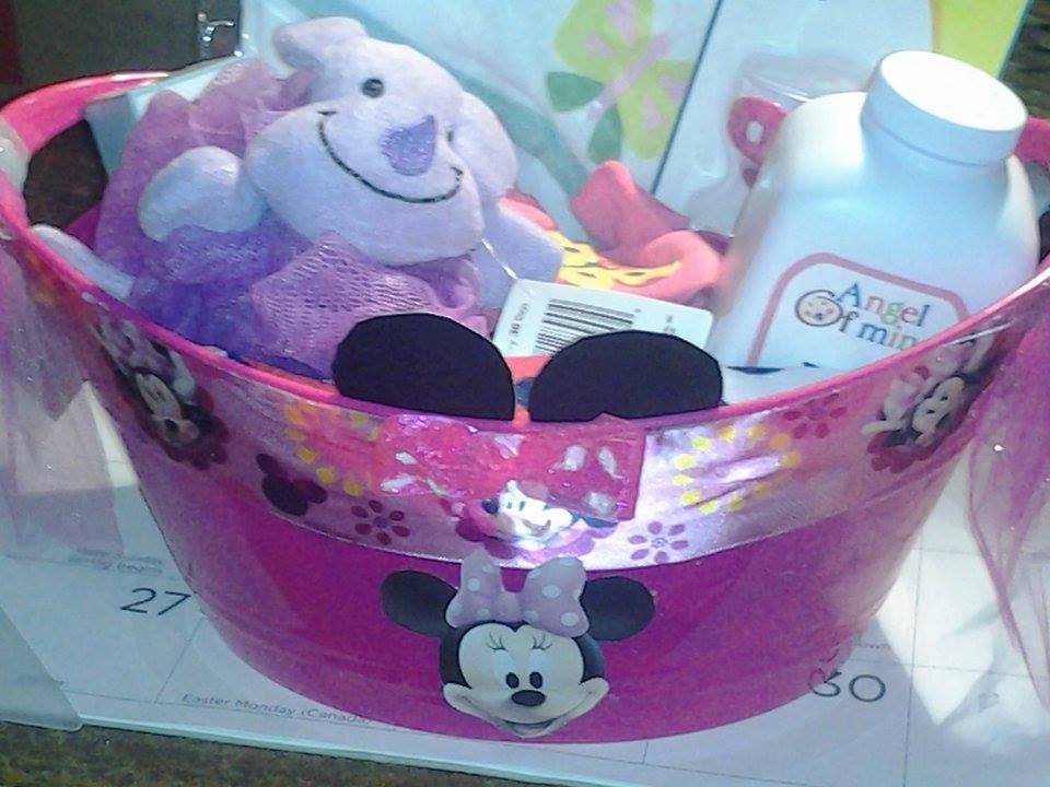 Baby Minnie Basket 2 contains a butterfly baby towel, 2 pack of pacifiers, baby powder, diaper rash ointment, butterfly booties, formula dispenser, and a bath sponge in a pink plastic basket decorated with Minnie Mouse pic and ribbon, Wrapped in plastic and tied with a bow and Minnie ribbon THIS ITEM HAS FREE DOMESTIC U.S. SHIPPING 2-3 days