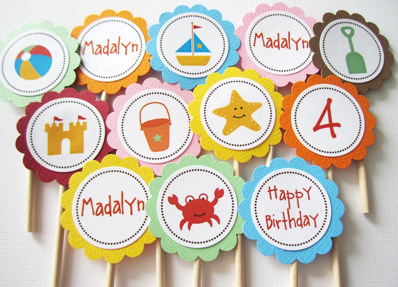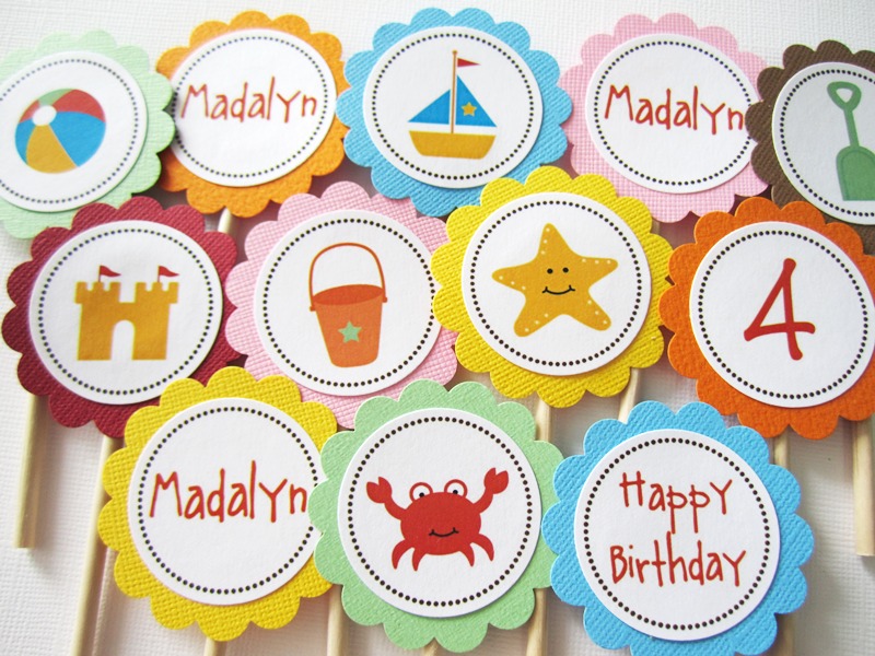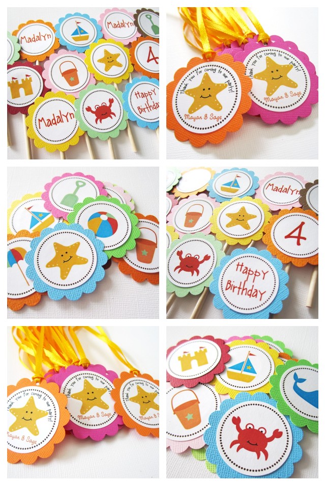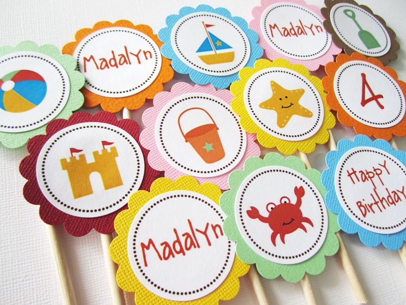 Adorable bright and cheerful Beach or Luau themed party Cupcake Toppers are perfect to adorn your delicious and pretty cupcakes. If you are planning for birthday, baby shower, or summer parties, consider serving cupcakes and do not forget to get these cute beach toppers that include images of sand castle, pail, scoop, ball, crab, sailboat, starfish and personalized text toppers such as name and age or any short phrase text you have in mind. You will receive a mix of 12 Beach themed Cupcake Toppers. Pictures are samples only. *** IMPORTANT, HOW TO ORDER*** To avoid delay of your order being completed, on your way checking out, let me know: 1. NAME and AGE for birthday Or BABY NAME if it's for a baby shower; or any other short texts. 2. When the party is. 3. Specific image if any. Colors maybe different than shown, depending on availability; however, should you have preference in colors, please let me know. I would love to match your party scheme colors. Each paper cupcake topper measures 2 inches. Image is printed on white cardstock, adhered to bazzill textured cardtock. Wood dowel or lollipop stick will be used based on availability. If you have a preference, please ask me first. Are you looking for matching party decorations? Look no further! To name a few, I can do: Favor Tags or Gift Tags Cupcake Toppers Door Sign Banner Water Bottle Labels Stickers Place Cards Food Tent Cards Napkin Rings I can also do invitations for baby shower, birthday, or wedding. I love custom orders! Visit the FAQ page for timeline: http://adorebynat.storenvy.com/faq Adorebynat - Handmade Adorable Party Decors and Stationery