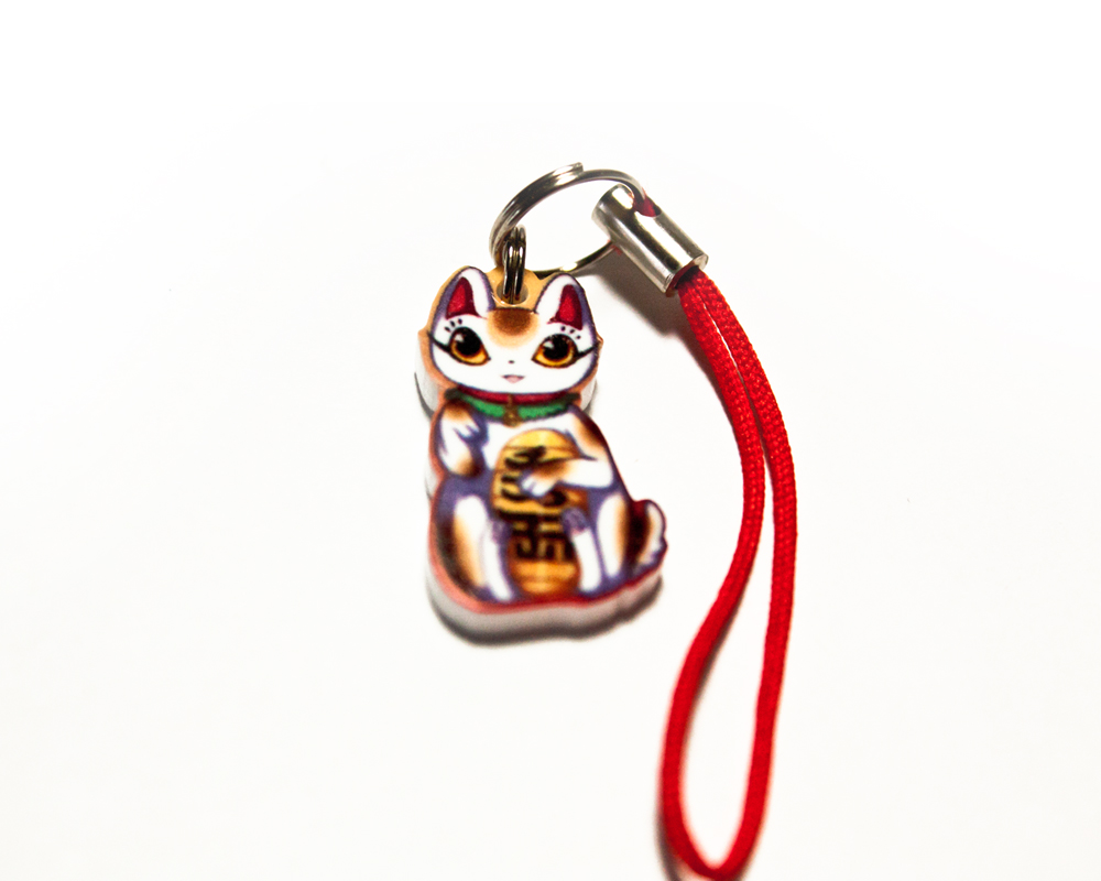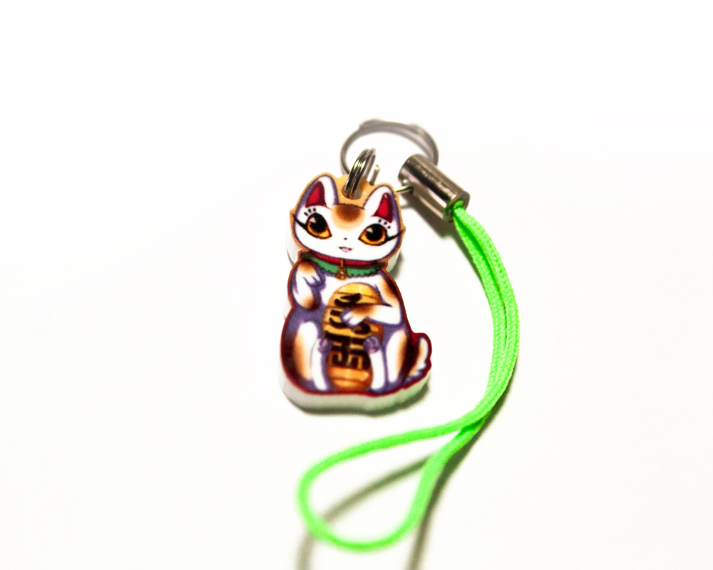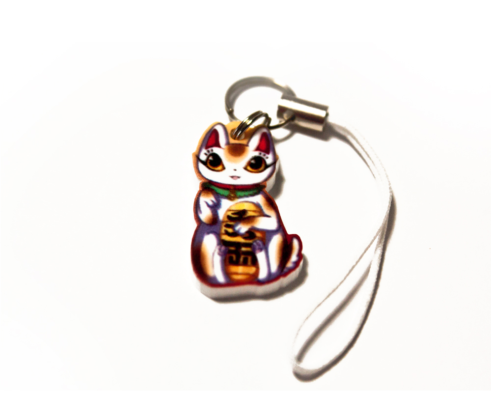 Maneki-neko or "lucky cat" is a devoted companion that will swipe up luck wherever they find it for their masters. You'll never run out of luck with this little guy around . Charm measures about 1" x .5" Acrylic is scratch-resistant, shatter-resistant, and water proof! Charm strap color varies. If no color is specified a random one will be chosen