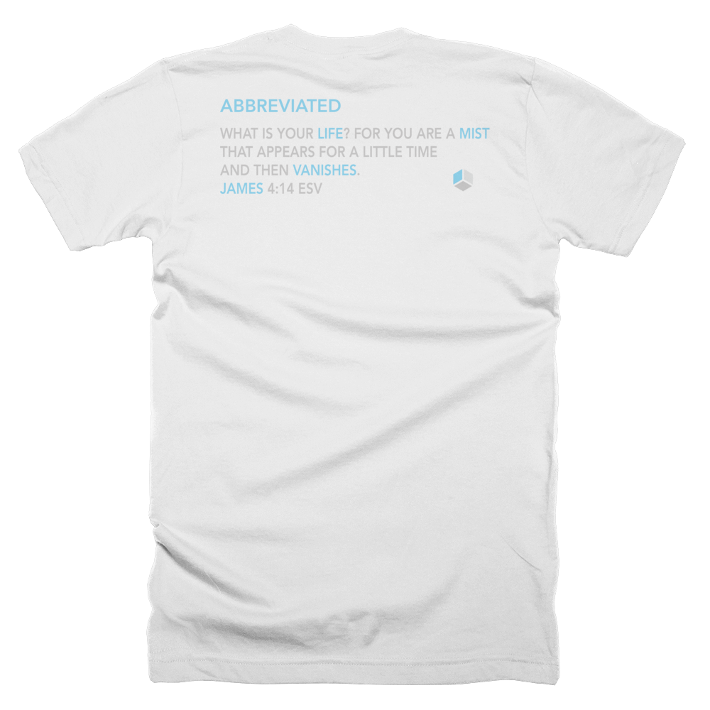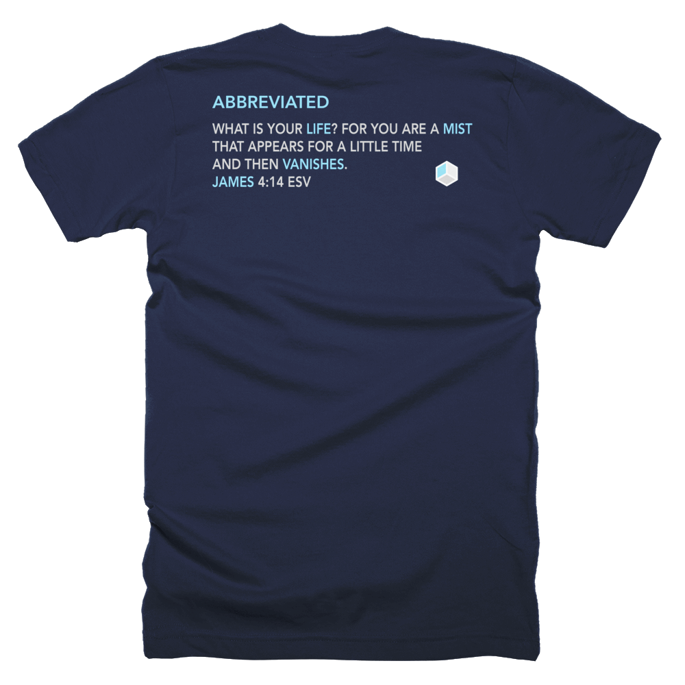 The "Abbreviated" tee is a reminder that life is short and "a mist," according to James 4:14. Our brand name is seen on the front in an "abbreviated" form with the James 4:14 passage on the back with our cornerstone icon.